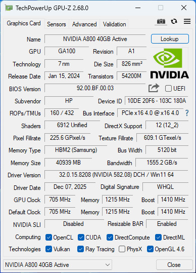 Eladó a HP RTX A800 40GB grafikus kártya, kiváló állapotban, munkafolyamatban is tesztelve, teljesen megbízható, számlaképes, ideális profi felhasználóknak AI, deep learning, 3D modellezés, CAD, VFX és render feladatokhoz.