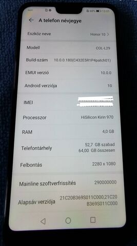 Eladó a képeken látható állapotban lévő Huawei Honor 10 4GB/64GB androidos készülék Phantom Blue színben.