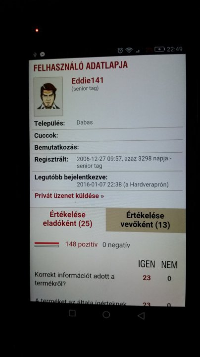 " Eddie141 felhasználónak 182 pozitív és 0 negativ értékelése van a fórumon! "