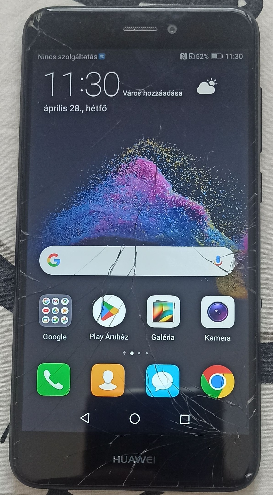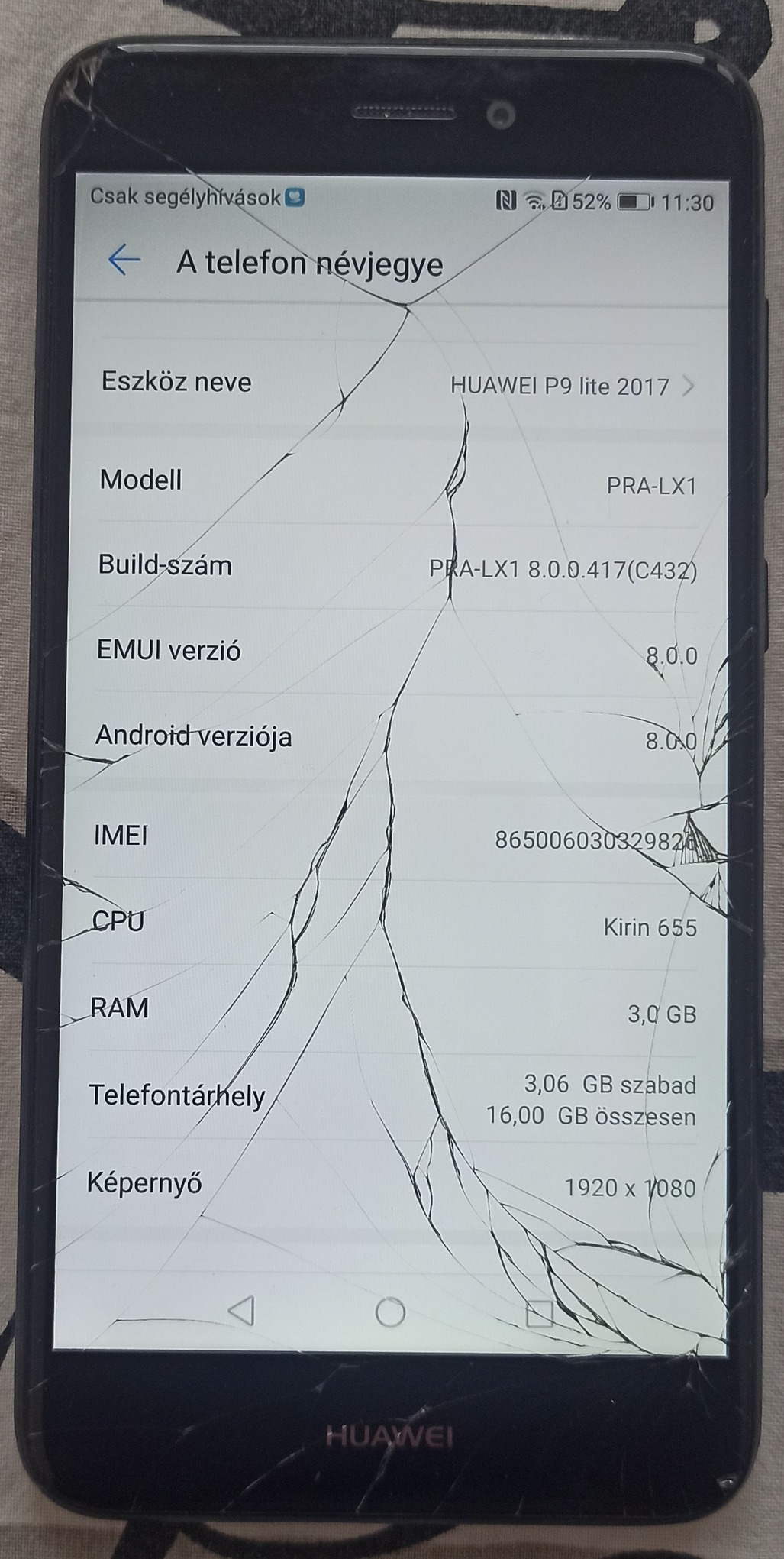 A készülék a képeken látható állapotban van: a kijelzővédő üveg repedt, de ez kizárólag az üveget érinti, a működésben semmilyen problémát nem okoz. Az érintésérzékelés a kijelző teljes felületén hibátlanul működik.