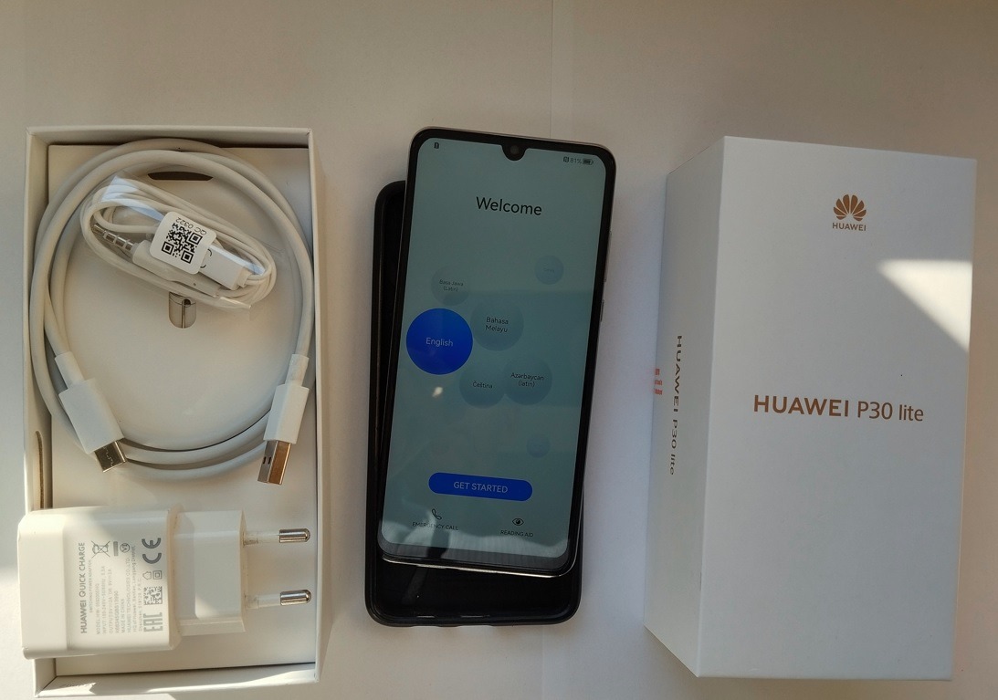 Huawei P 30 Lite - dobozában, adapter, töltőkábel, füles