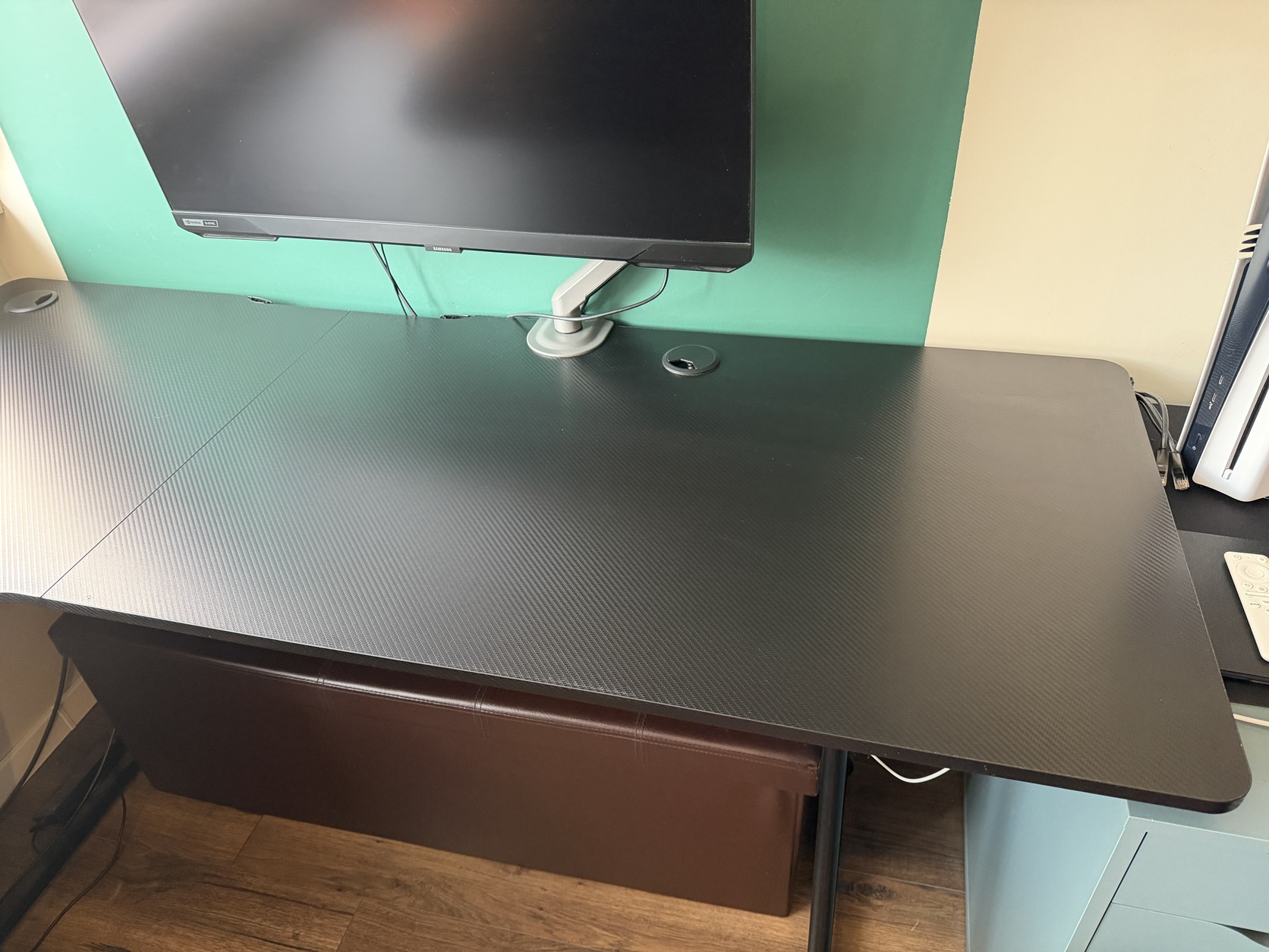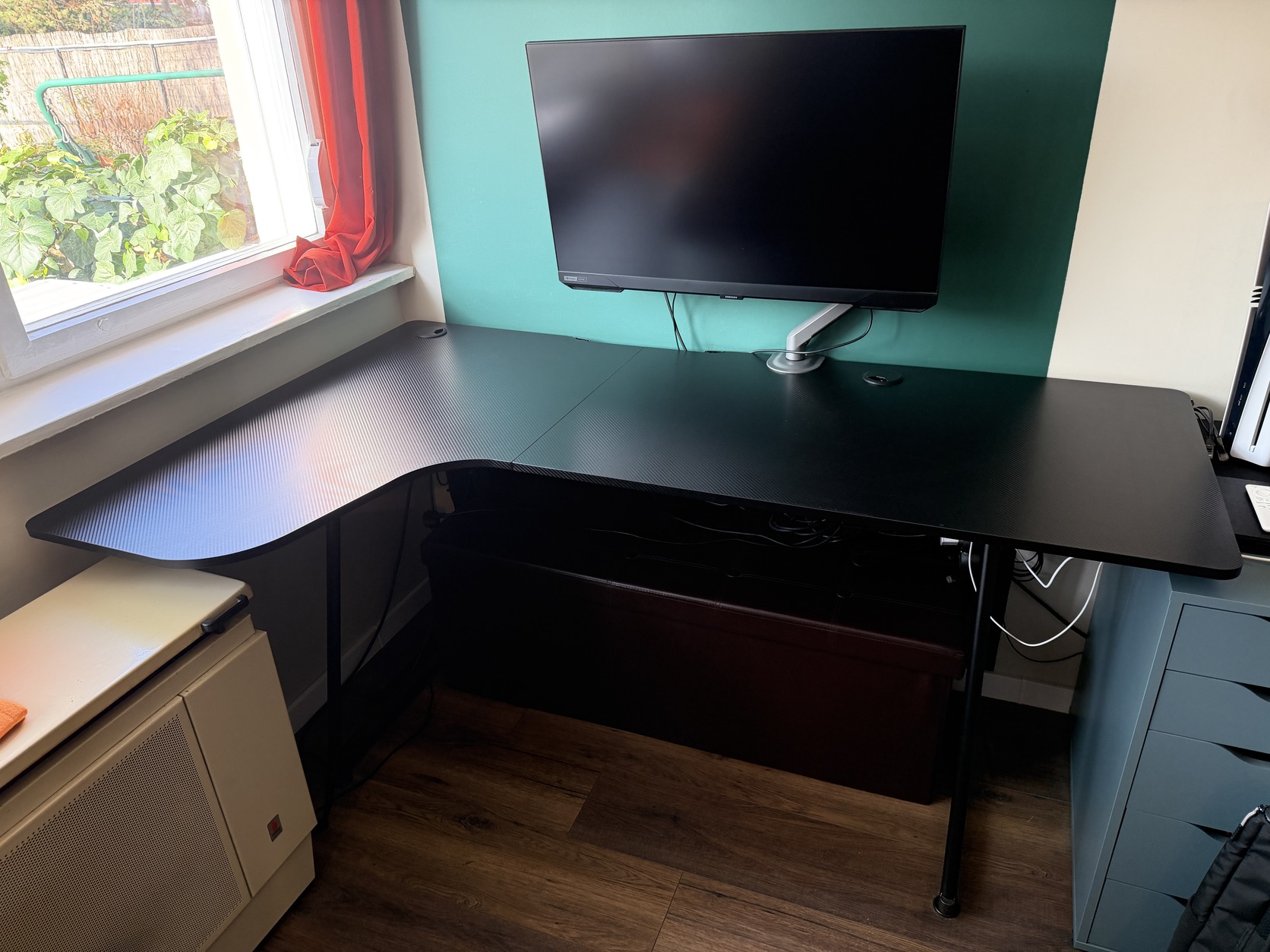 A fejhallgatótartót felszereltem az asztalra korábban, a pohártartót viszont nem, így azt valószínűleg meg sem találom már, anélkül árulom.