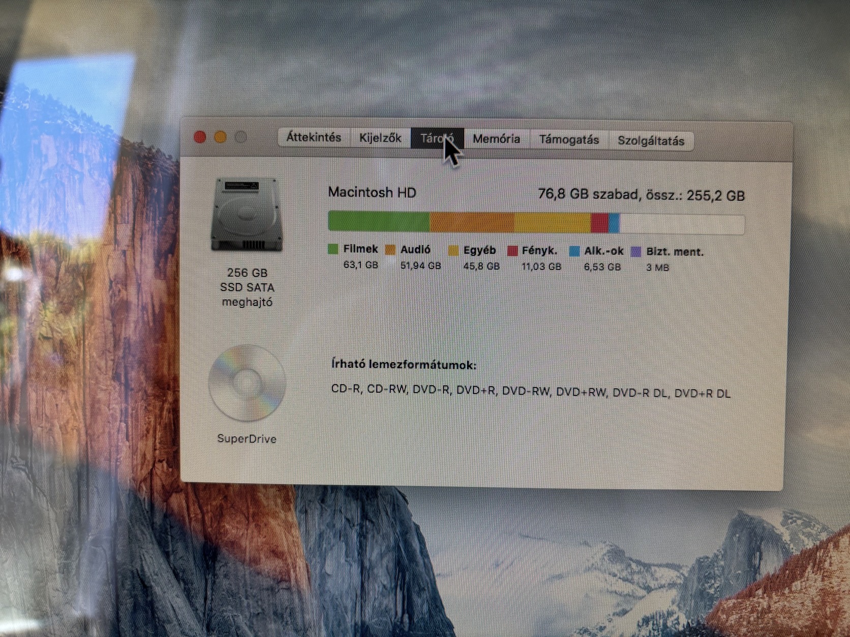 A háttértár le lett cserélve egy 250 GB SSD-re, emiatt én raktam fel rá az El Capitan-t USB-ről, ennek hála indításnál megjelenik a konzol, de hibátlanul bootol és a rendszer tökéletesen fut és korához képest egészen gyors.