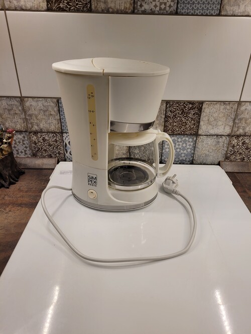 Egy filteres kávéfőző - hibás, tehát nem működik, de lehet hogy javítható. Egyik nap bekapcsoltam de többé nem csinált semmit Mi vettünk újat, nem értek hozzá, nyilván javítás csak szakembernek ésvagy saját felelősségre, kb 3 alkatrész lehet benne, amiből 2 a kábel és a fűtőszál). A kiöntő kancsó egyik pöcke eltört így a teteje lejár, de nem befolyásolja a működést.