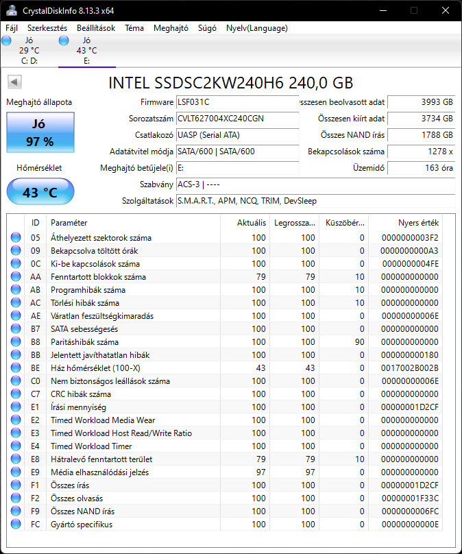 Intel 540s Series 240GB SATA3 [ 97% , 163 óra / ~4TB írás ]
