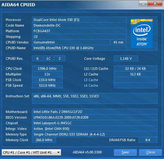 Intel Atom 330 2x 1.60GHz, 2GB RAM, 320GB