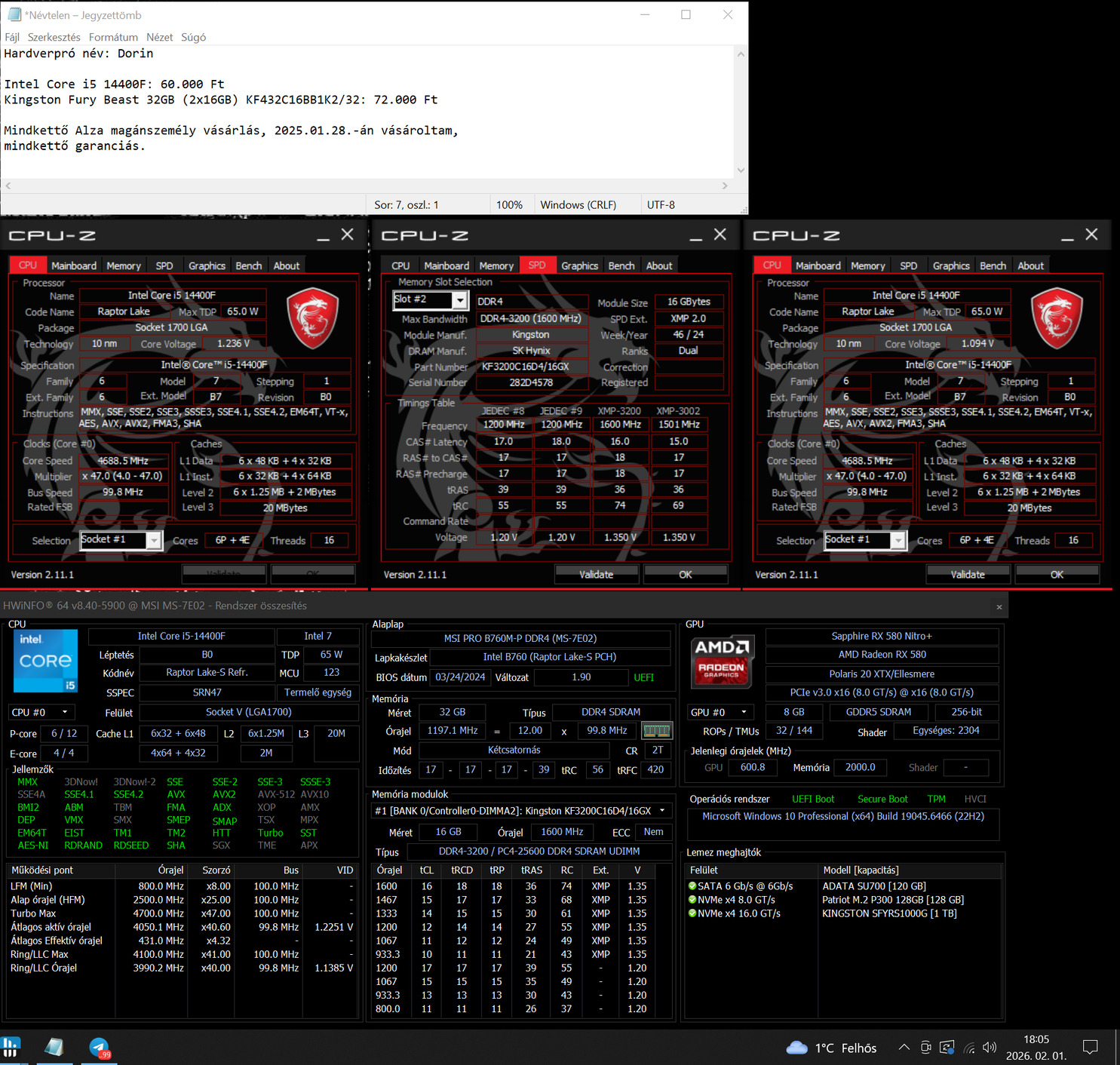 Eladó Intel Core i5 14400F processzor gyári hütövel. 2025.01.28.-án vásároltam Alzában magánszemélyként, garanciás. Jelenleg is használatban van, így kérésre bármilyen benchmarkot tudok készíteni, videózni.