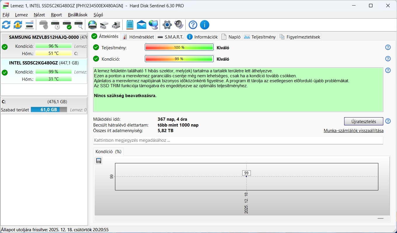 Teljesítménye: 128K Sequential R/W, 550/510 MB/s, 4KB Random R/W, 91K/60K IOPS