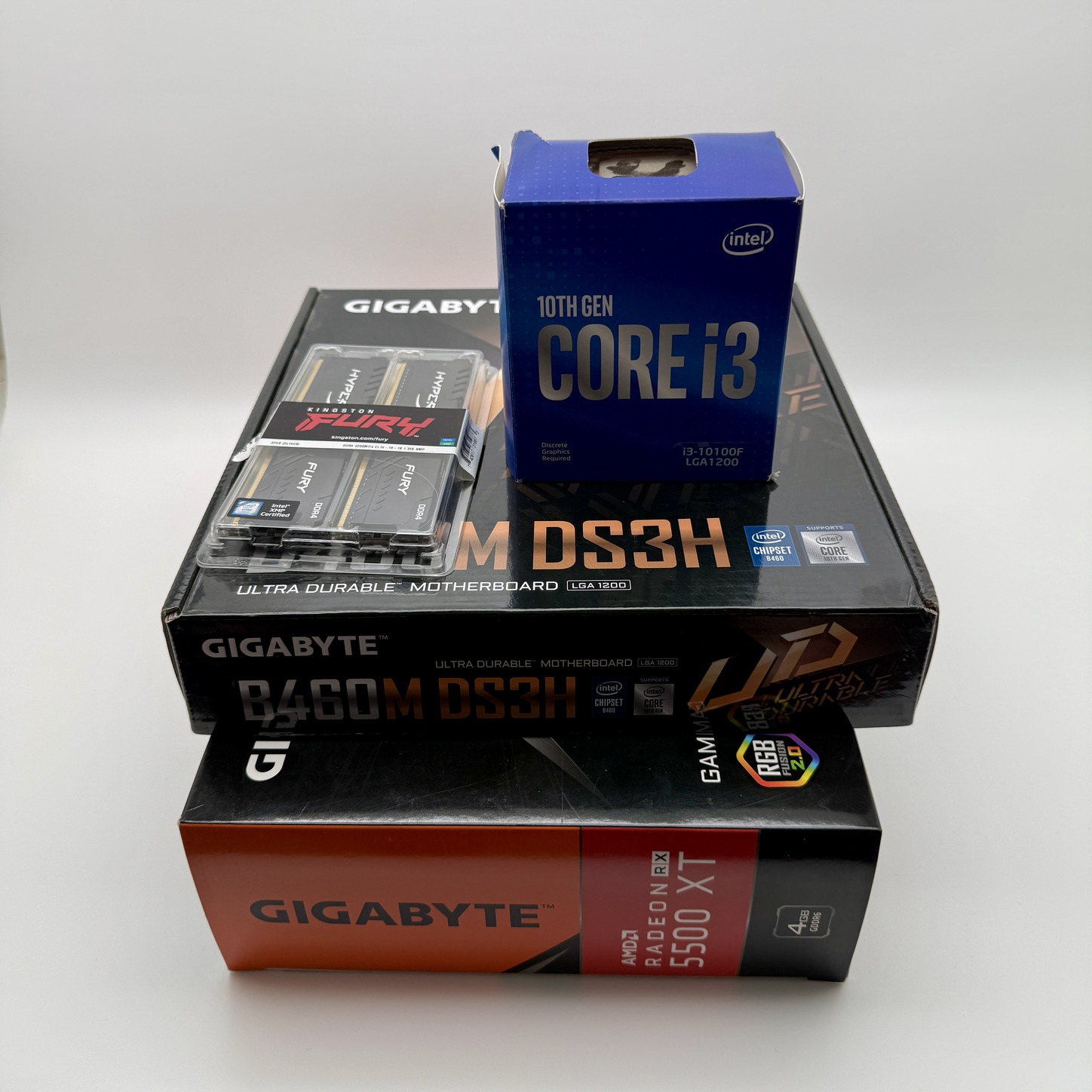 Intel i3-10100F + RX 5500 XT 4GB + kingston hyperx fury 32gb 2x16gb + B460M-DS3H Félkonfig eladó