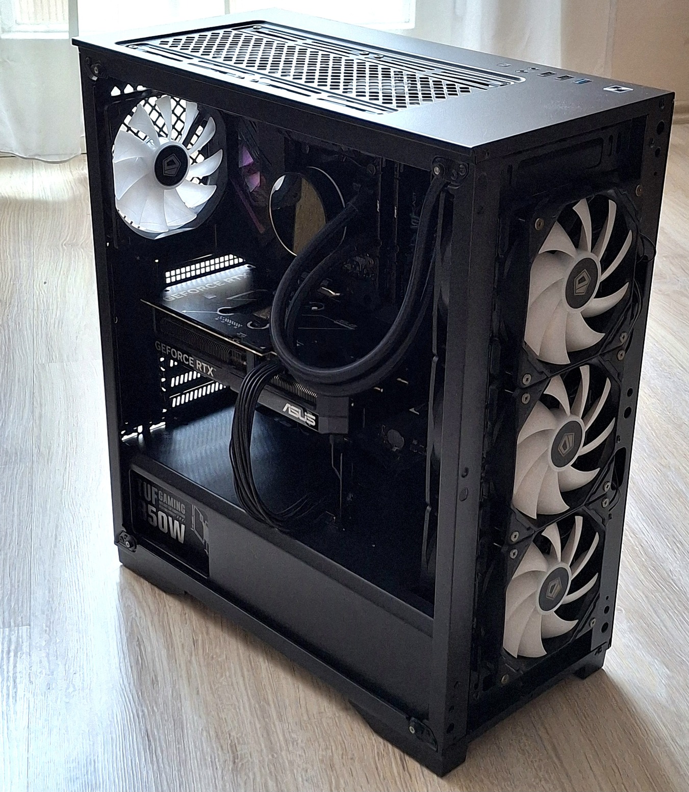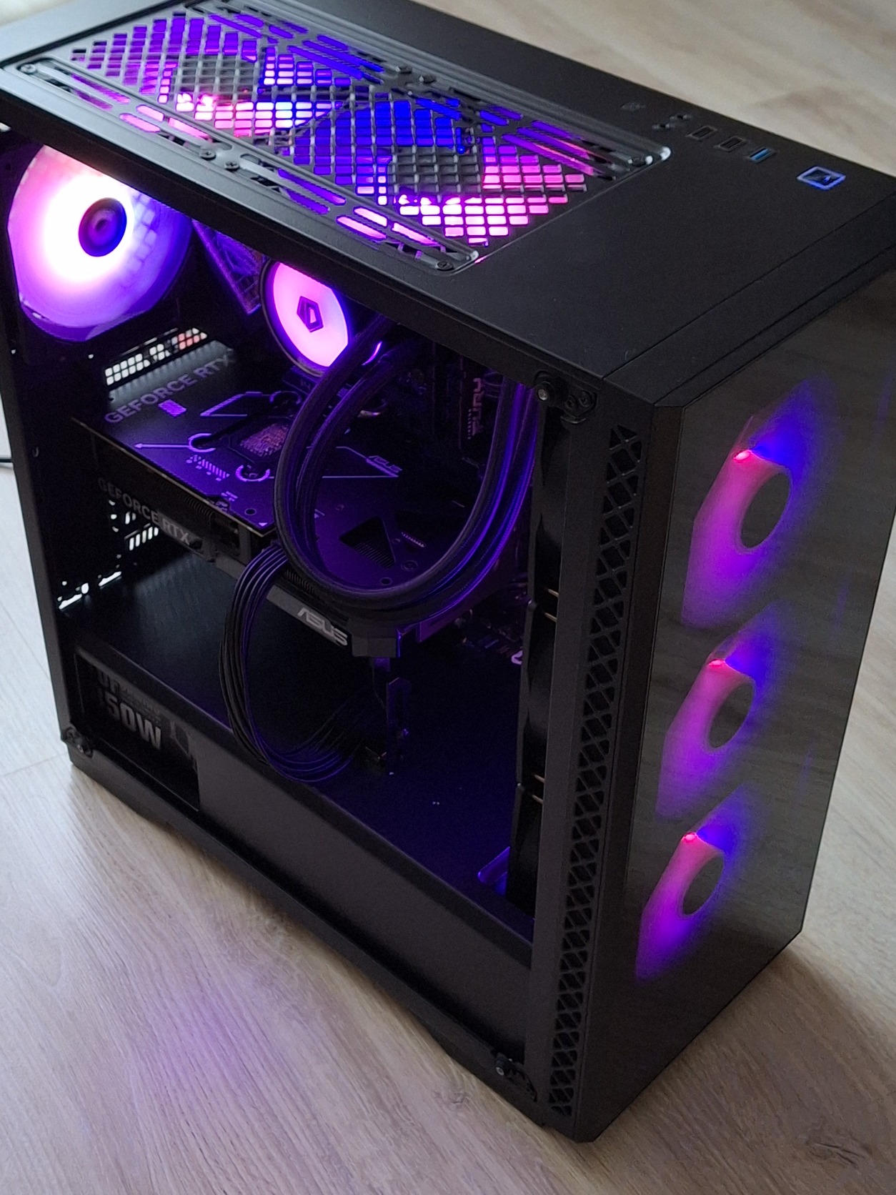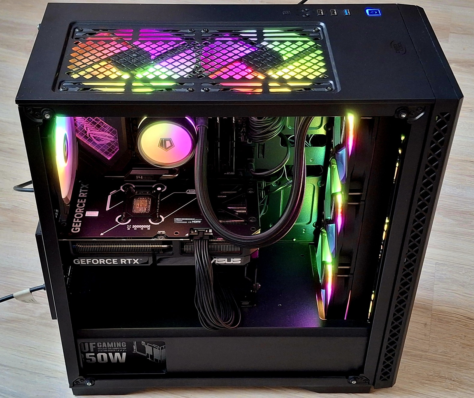Ház: DeepCool, 9 db Argb ventivel, a cpu vízhűtőn 6 db 120mm-es (3 elöl, 3 belül), a ház tetején 2 db 140mm-es, hátul egy db 120mm-es.