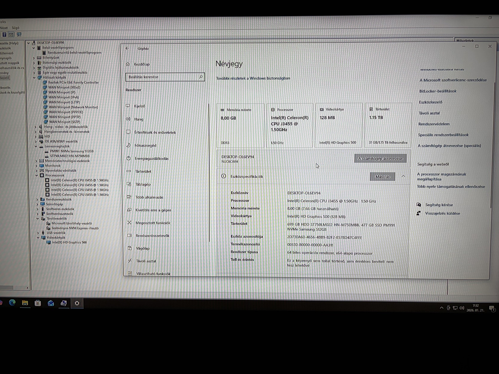 SSD: Samsung PM991 NVMe 2230 512GB SSD a wifi kártya helyén (lenne benne egy Intel® Dual Band Wireless-AC 3168 + Bluetooth 4.2, igény esetén adom mellé)