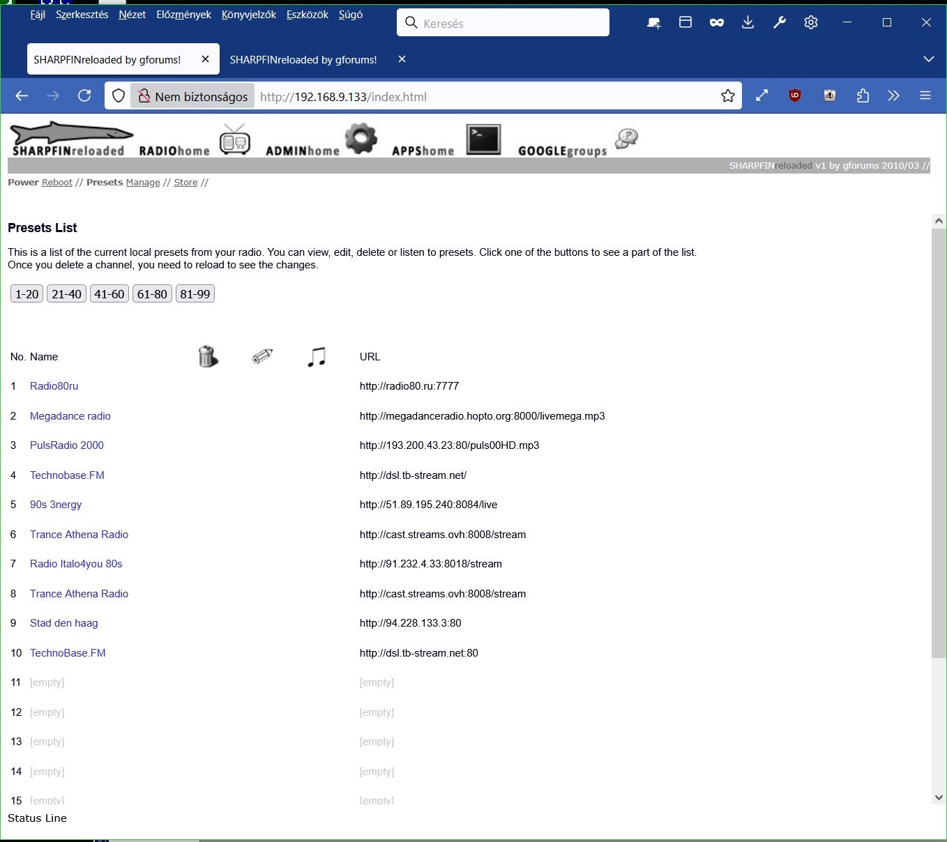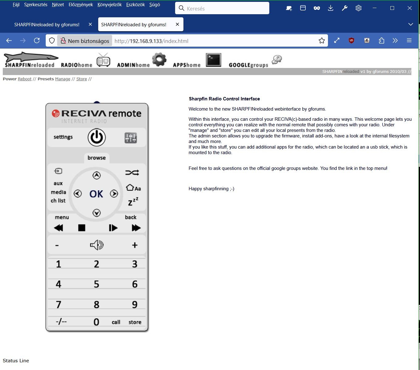 A rádió támogatását a gyártó (RECIVA) évekkel ezelőtt gusztustalan módon megszüntette, úgy hogy utána gyakorlatilag megszűnt működni a rádió. A rádióra alternatív firmware-t, a SHARPFIN Radio-t telepítettem, ezzel jól működik, de az eredeti menü csak részben használható. A csatornákat csak a webfelületen lehet programozni böngészőből, és a csatorna váltás is webfelületről megy.