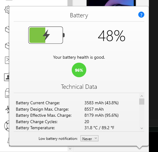 A tabletet jegyzetelésre szerettem volna használni, viszont az ötlet meghiúsulása miatt nem használtam, így nagyon megkímélt állapotban maradt, az eszköz újszerű. Az akkumulátor szinte új: csak 20 töltési ciklus, 96%-os egészségi állapot (iMazing adatok alapján).