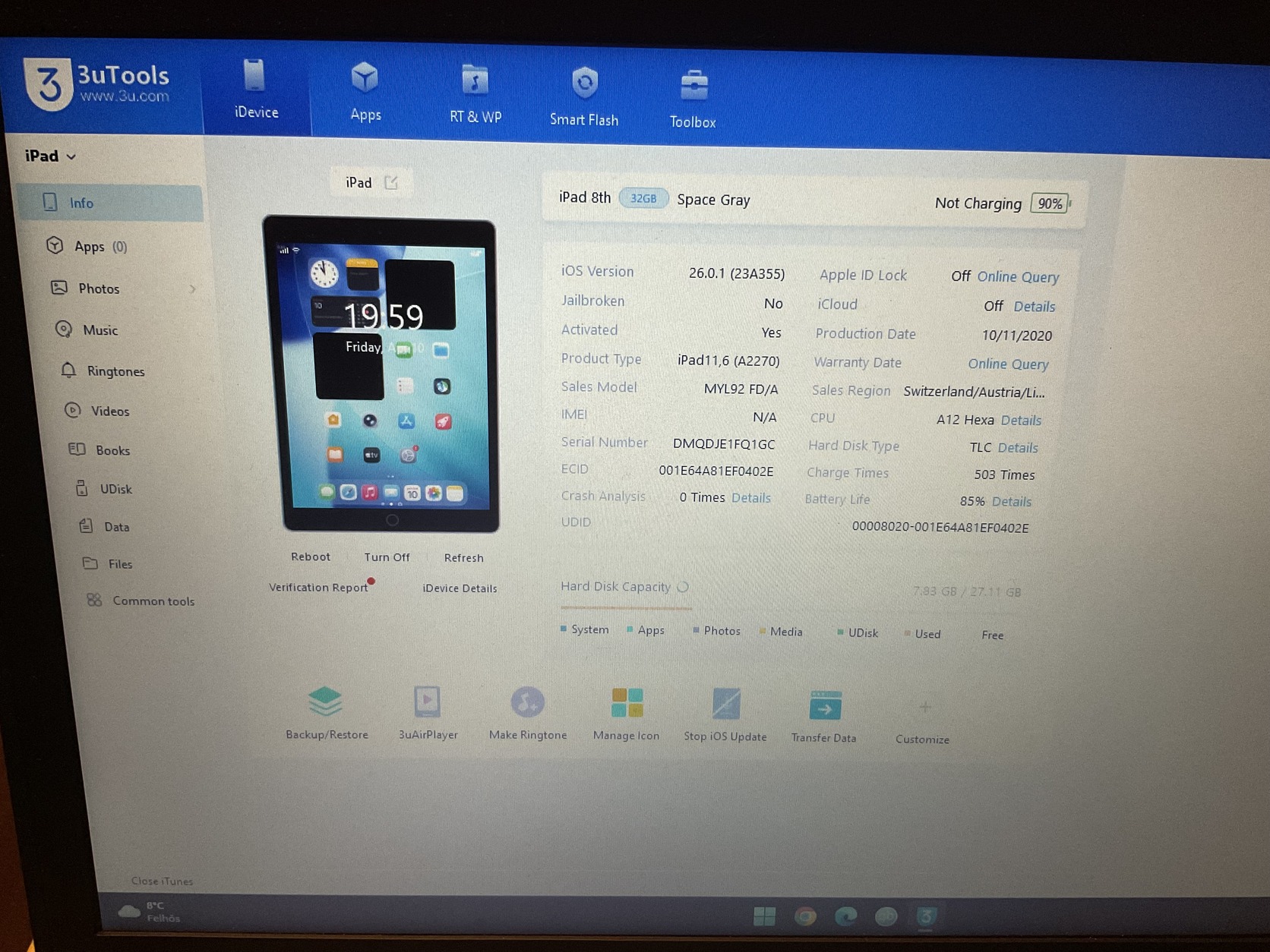 Az iPad tökéletes állapotban van, gyakorlatilag karcmentes. Minden funkciója tökéletesen működi, az akkumulátor 85%-os. A kijelzőn védőüveg.