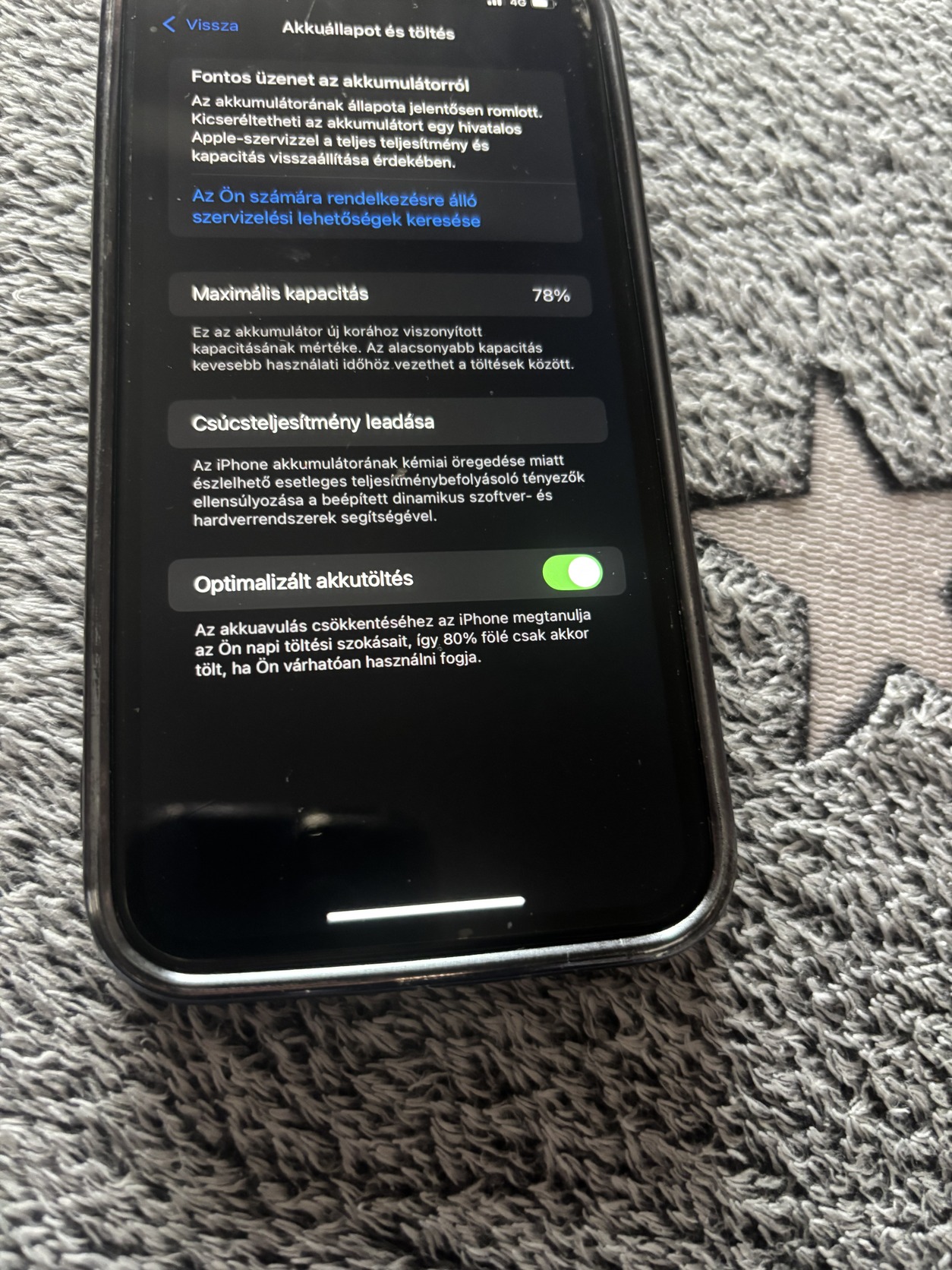 • Akkumulátor állapota: 78%