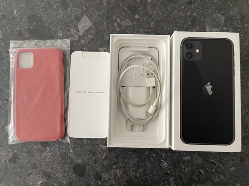 Gyári tartozékaival (telefon, doboz, töltőfej, fülhallgató (használatlan), Lightning kábel), továbbá egy utángyártott szilikon tok (használatlan)