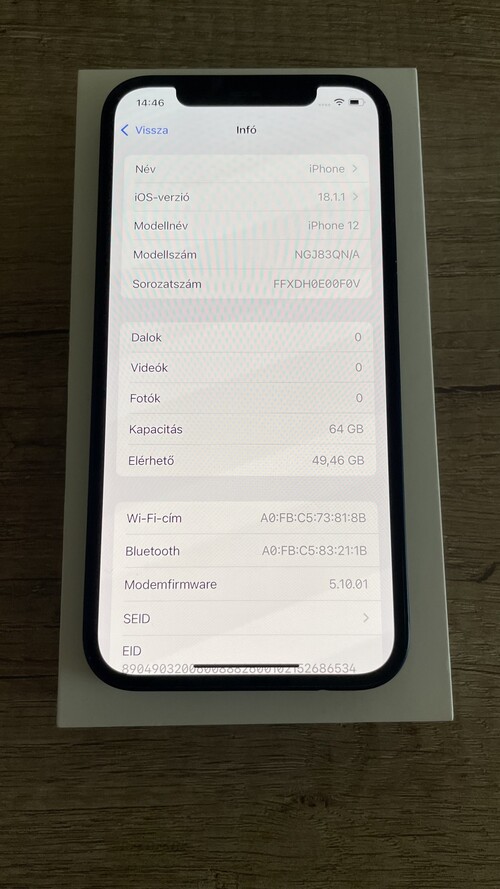 Eladó a képeken látható IPhone 12 64 GB kartyafüggetlen telefon. Tökéletesen működik minden funkciója. Face ID,mikrofonok stb. Doboz, töltő jár mellé és 2 szilikon tok. Karcmentes a telefon sajnos egy pici sérülés van az alján semmit nem befolyásol. Akkumulátor százaléka : 83%