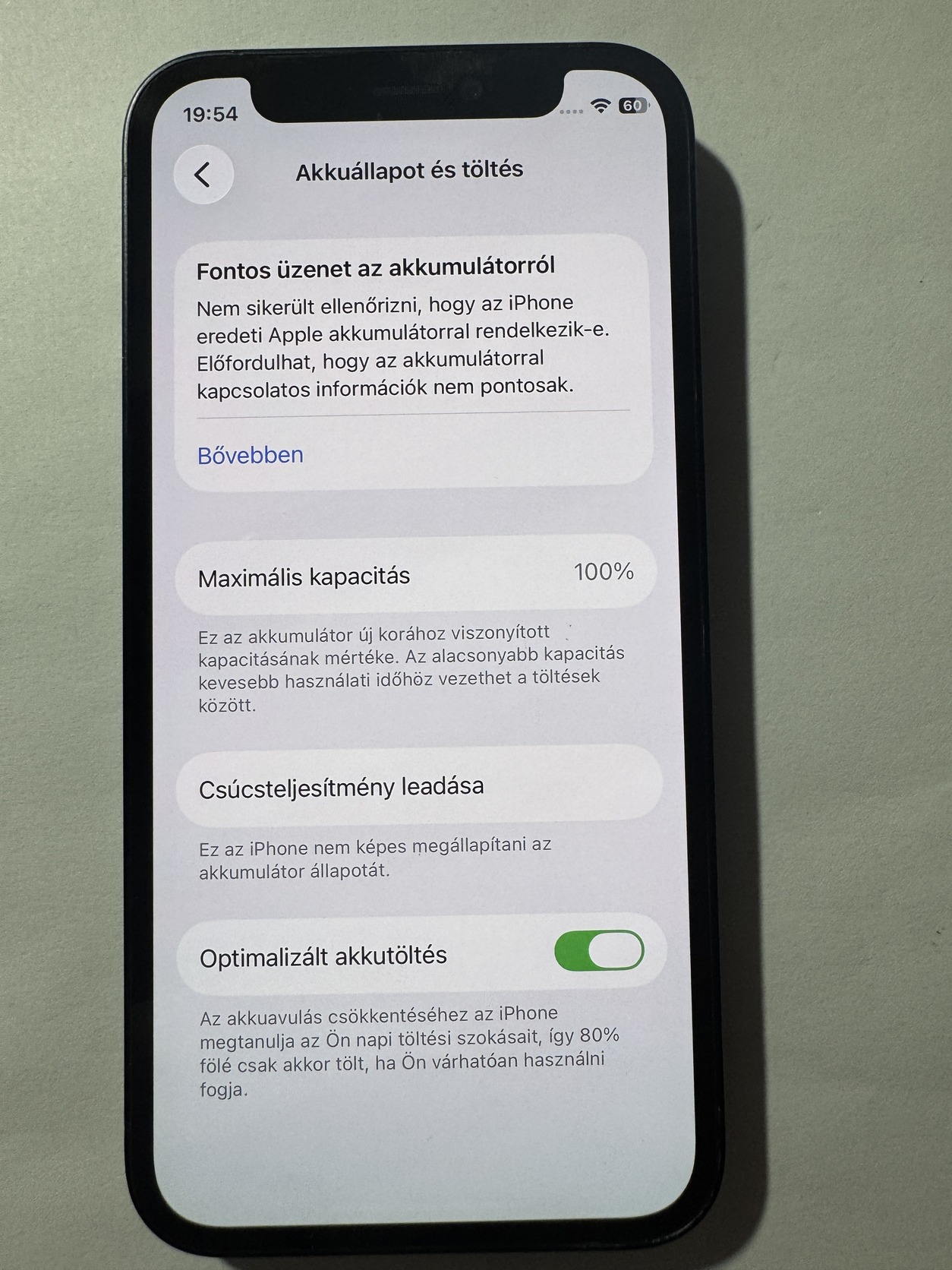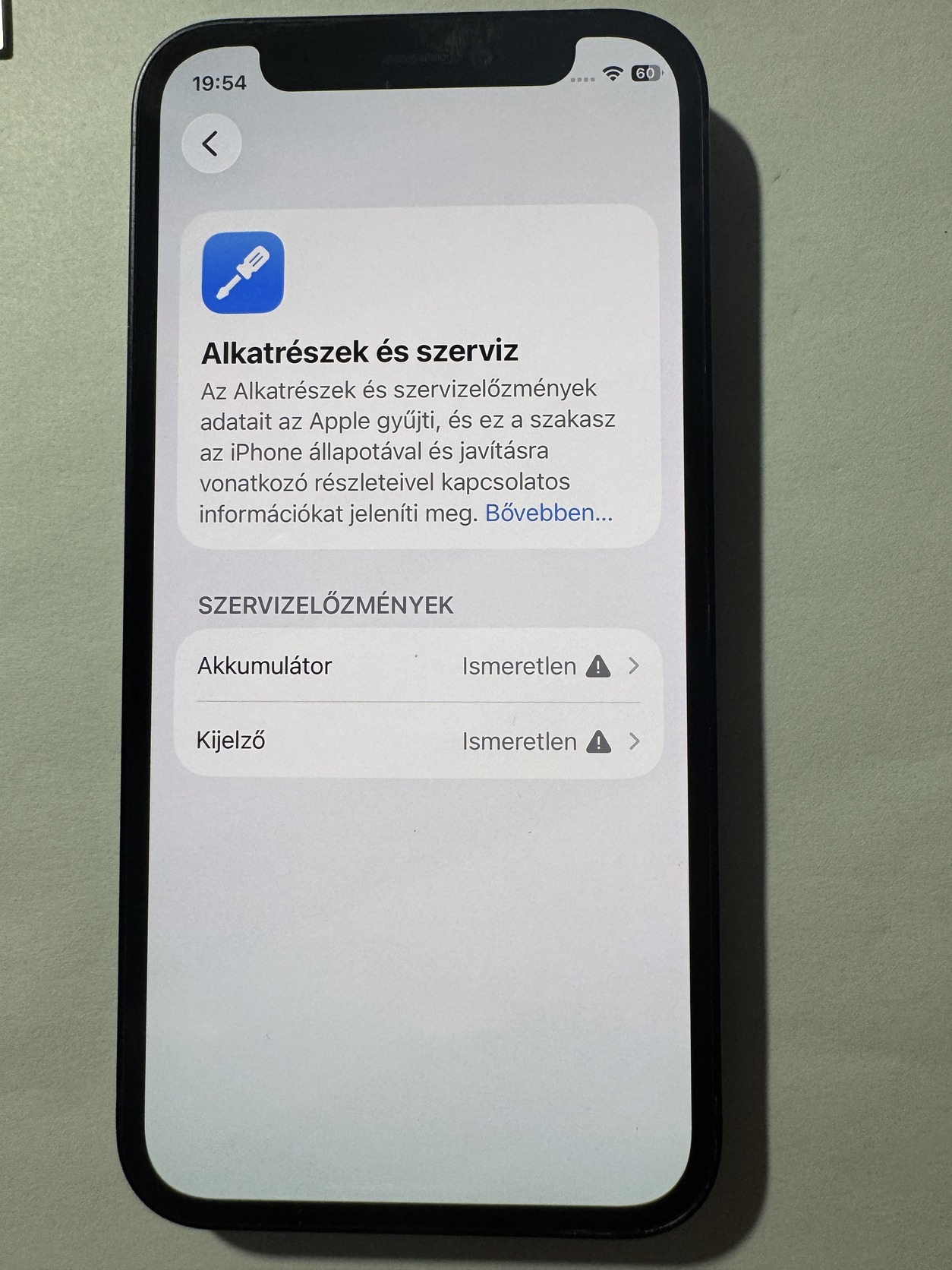 A szerelés miatt az akku és a kijelző (hiába volt gyári OEM) a szervizelési menüben ismeretlenként szerepel. A működést nem befolyásolja a True Tone, Face ID is működik.