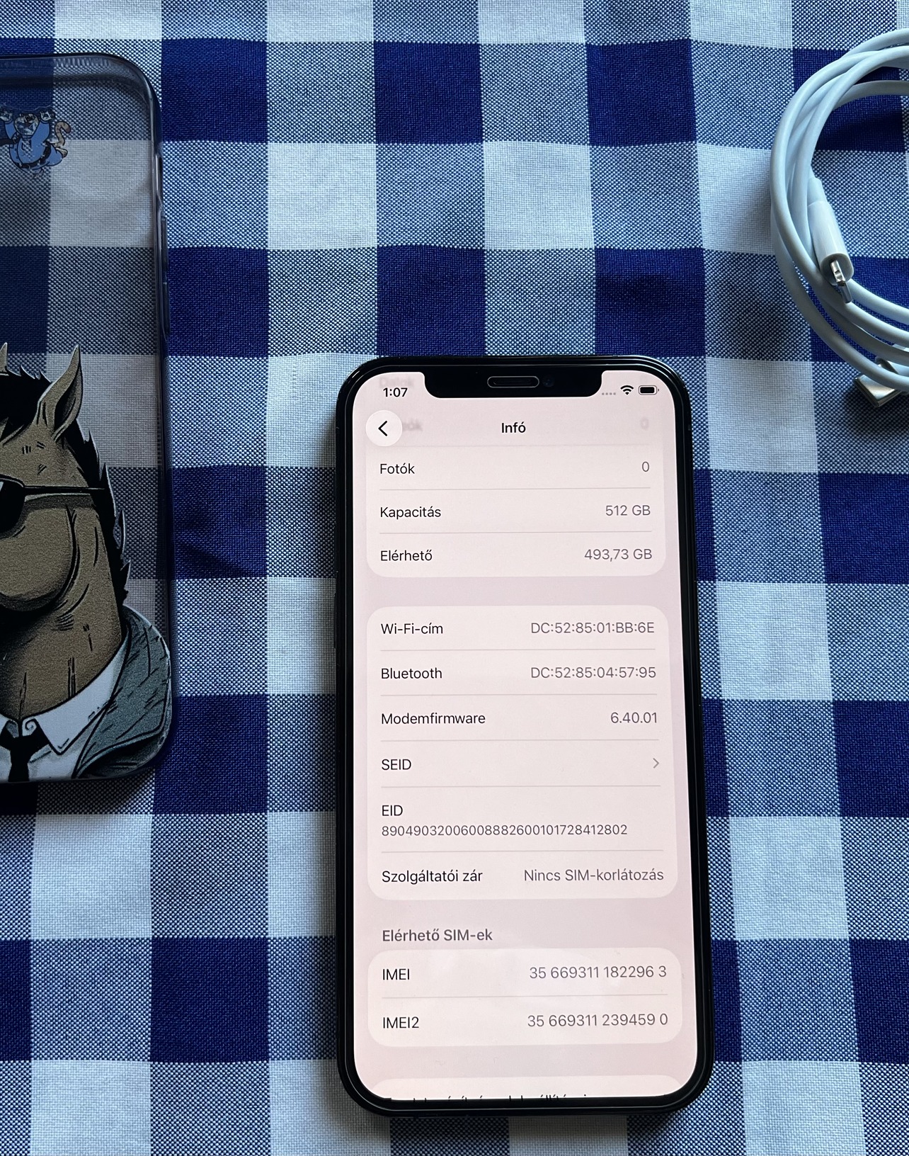 A keret oldalain enyhe használati karcok láthatók, az aljánál egy kisebb ütődésnyom van (fotókon dokumentálva). A kijelző cserélve lett egy utángyártott soft OLED panelre – az iOS ezt ismeretlen alkatrészként jelzi, működése szempontjából hibátlan, illetve nagyon szép képet ad. A hátlap és a kamera modul kifogástalan állapotban van.