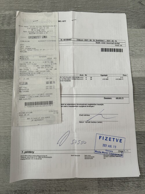 Eladó egy 2021 Augusztus 19-én egyösszegben vásárolt 128 GB-os iPhone 12 Pro Max. Pár hónaposan vettem a Hardverapró nevű oldalról, azóta nálam van. Telefon keretén, pár helyen apróbb karcok vannak, de semmi komoly, ami a működését befolyásolnák. Az akkumulátor 85%-os benne, cserélve nem volt. Összes tartozéka megvan, adom hozzá a számláját, plusz 3 db tokot, meg 4 db hydrogél kijelzőfóliát. 15 Pro-ra váltás miatt eladó. Garancia sajnos nincs már rá.