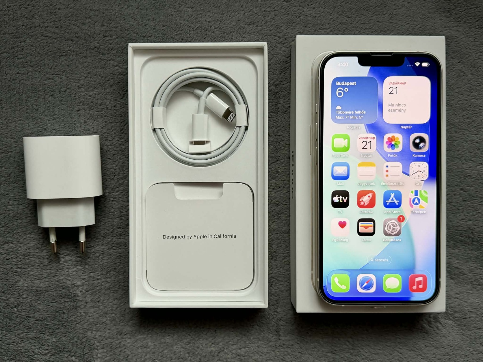 Gyári doboz, Töltő adapter és lightning kábel jár a telefonhoz ahogy a képen is látszik.