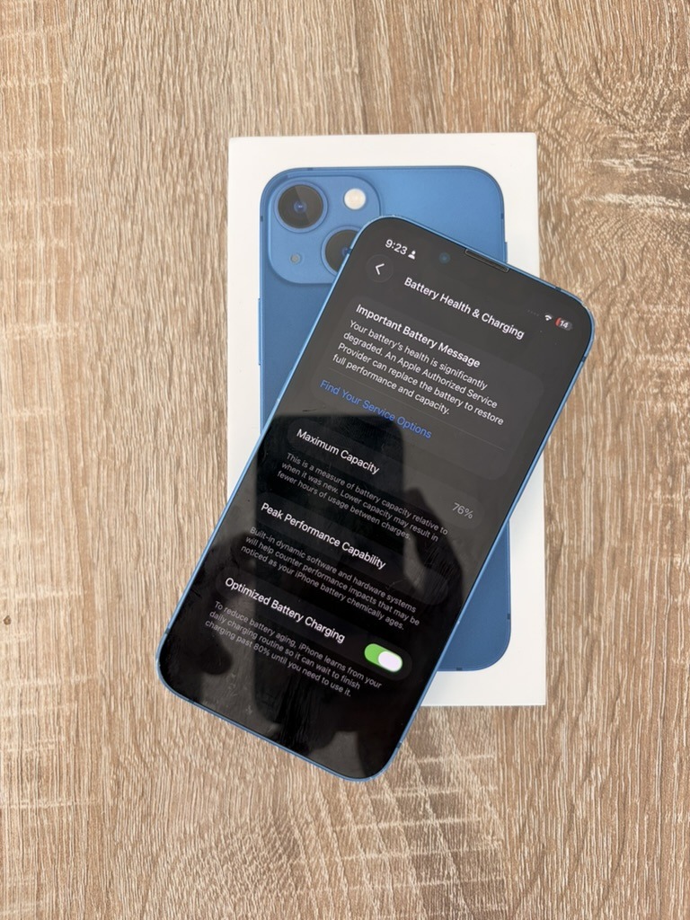 Eladó egy kék színű, 128 GB-os iPhone 13 mini, eredeti dobozával és töltőkábellel. A készüléken kisebb karcok és sérülések láthatók, az akkumulátor állapota pedig 76%-os (csere javasolt), ezért elsősorban másodtelefonnak vagy alkatrésznek ajánlom.
