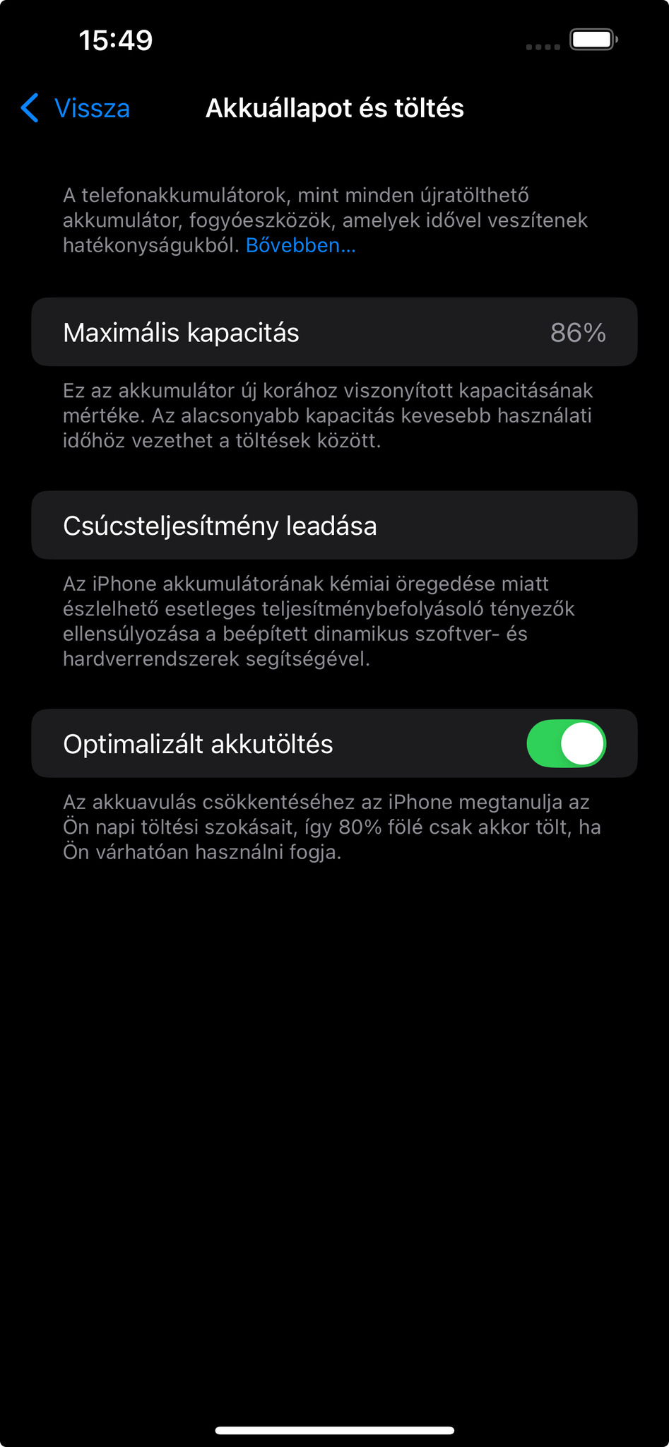Az akkumulátor gyári, az állapota 86%-os.