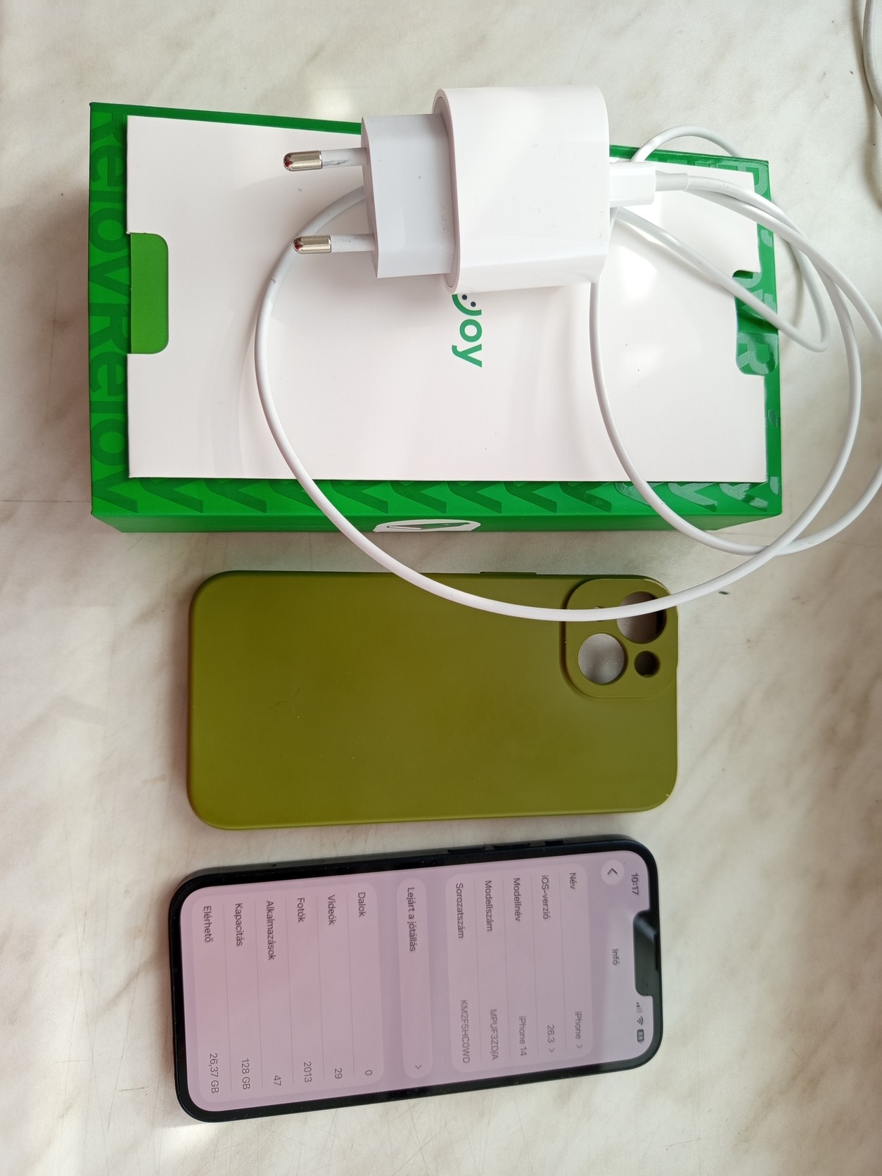 Eladó iPhone 14 128gb midnight black mobiltelefon. A készülék karcmentes elöl-hátul és gyári kártyafüggetlen. Minden funkció hibátlanul működik. Aksi 87%. Rejoy újszerű vásárlás volt és jelenleg is szinte makulátlan. Tartozékai: Rejoyos doboz, sim tű, olivazöld silicone tok valamint eredeti Apple kábel és töltőfej. Személyesen megtekinthető és átvehető Veszprémben, de foxposttal is tudom küldeni a vevő felelősségére +1900ft ellenében a teljes összeg előre utalása után. Személyes átvétel esetén az ára 85000ft, foxal 87000ft.