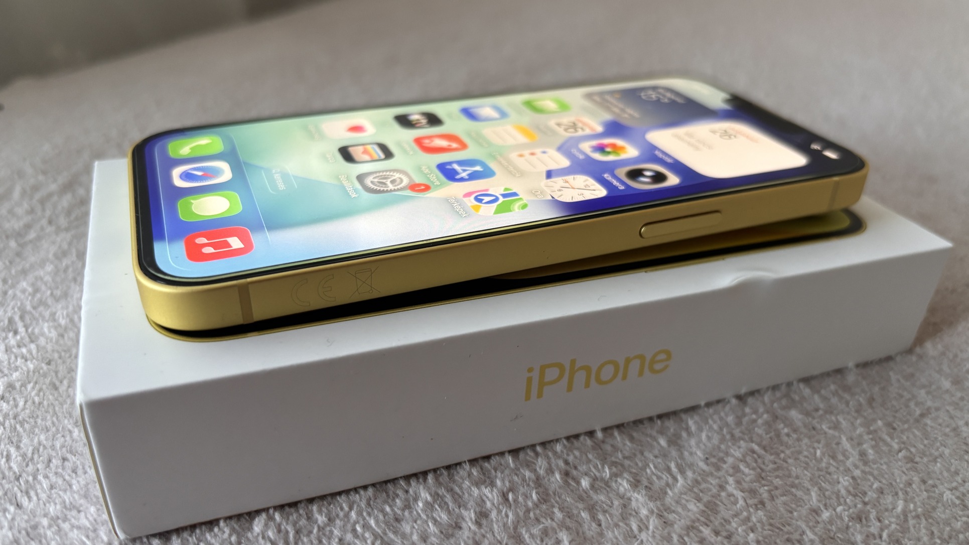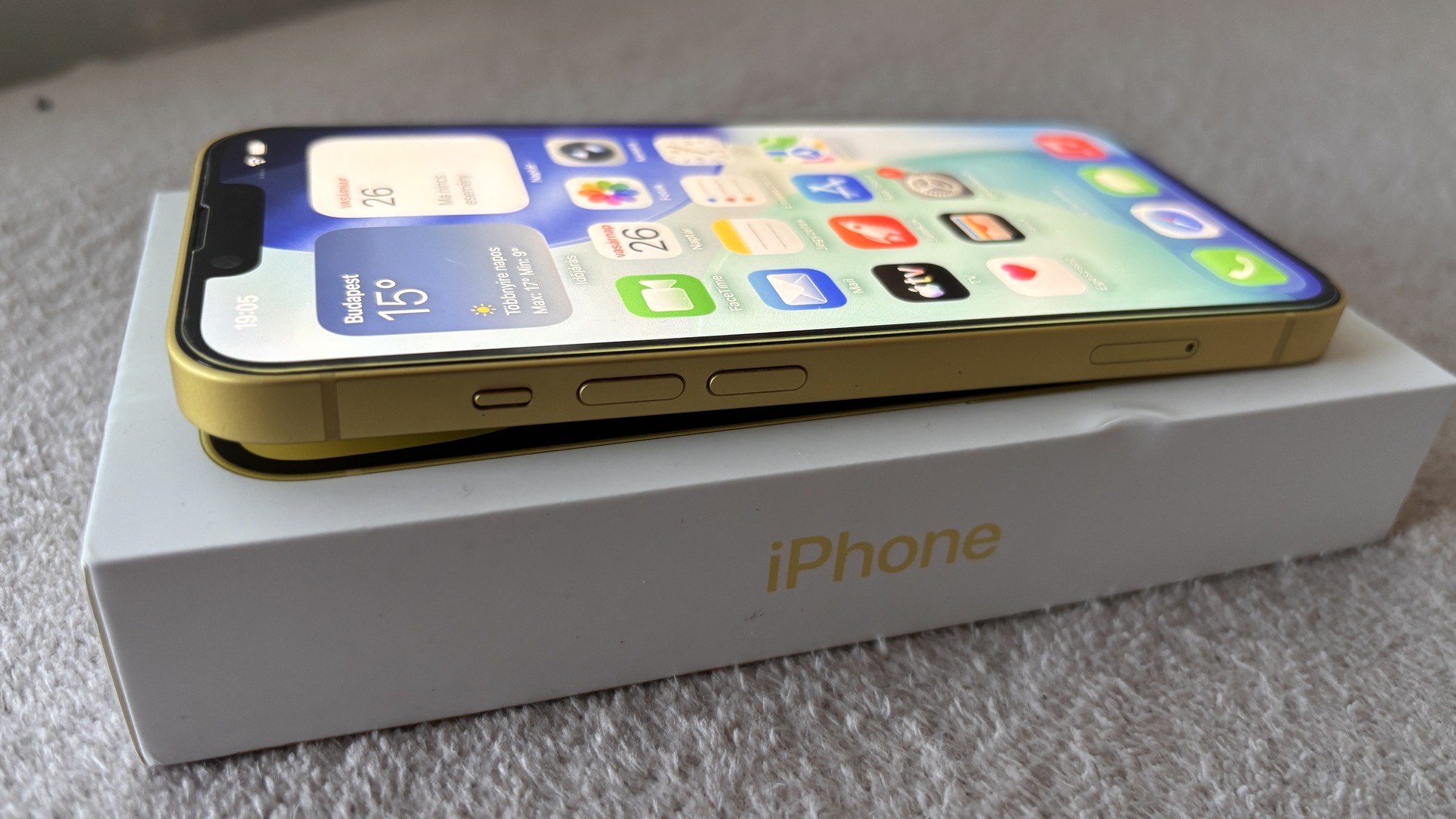 Eladó iPhone 14 128GB-os sárga színű, kártyafüggetlen telefon jó állapotban. Tartozékai: doboz, gyári töltő, és egy új tok. Akkumulátor 84%-os állapotban van. Még 2026.05. végéig garanciás a yettelhez.