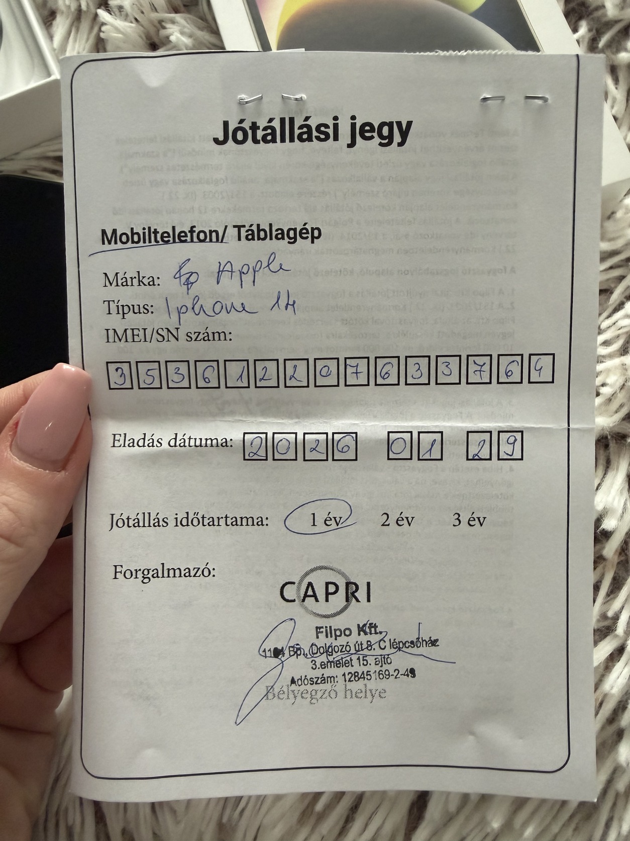 Eladó 2026.01.29-én vásárolt iPhone 14, teljesen hibátlan állapotban, 1 év garanciával. Aksi 99%, elől-hátul karcmentes, vásárlástól kezdve fóliában és tokban volt tartva. Eredeti dobozzal és töltővel együtt adom + ajándék 2 db tok és 1 töltőkábel. Csere nem érdekel, készülékváltás miatt adom el.