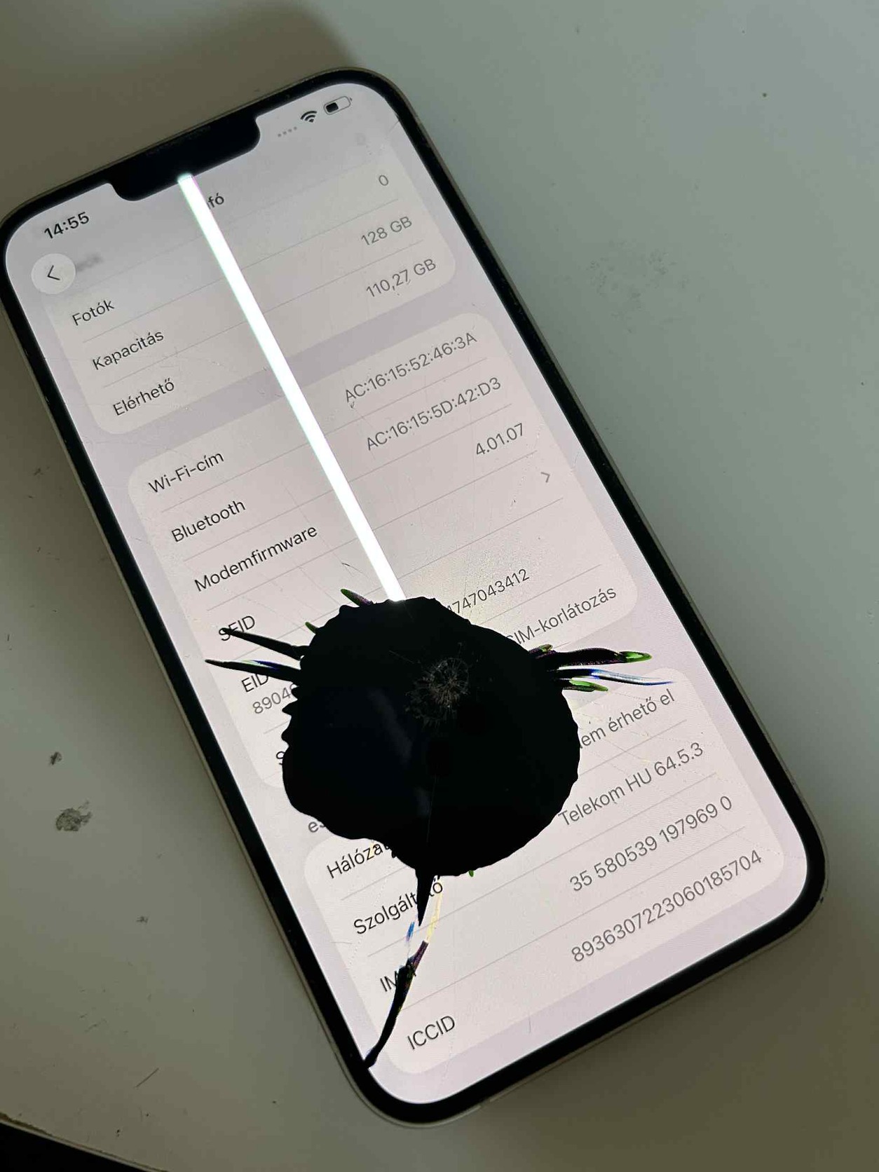 Sajnos le esett és széttört a kijelzője, de a keret szép és a hátlap is a bal kereten van egy két pötty de ezt leszámítva szép állapotban van egy kijelző csere után tökéletesen használható!