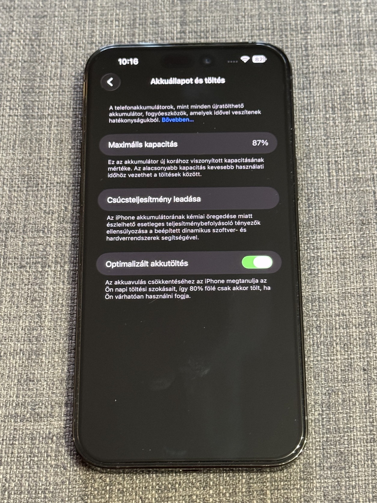 A készülék gyárilag független, akkumulátora 87%-os.