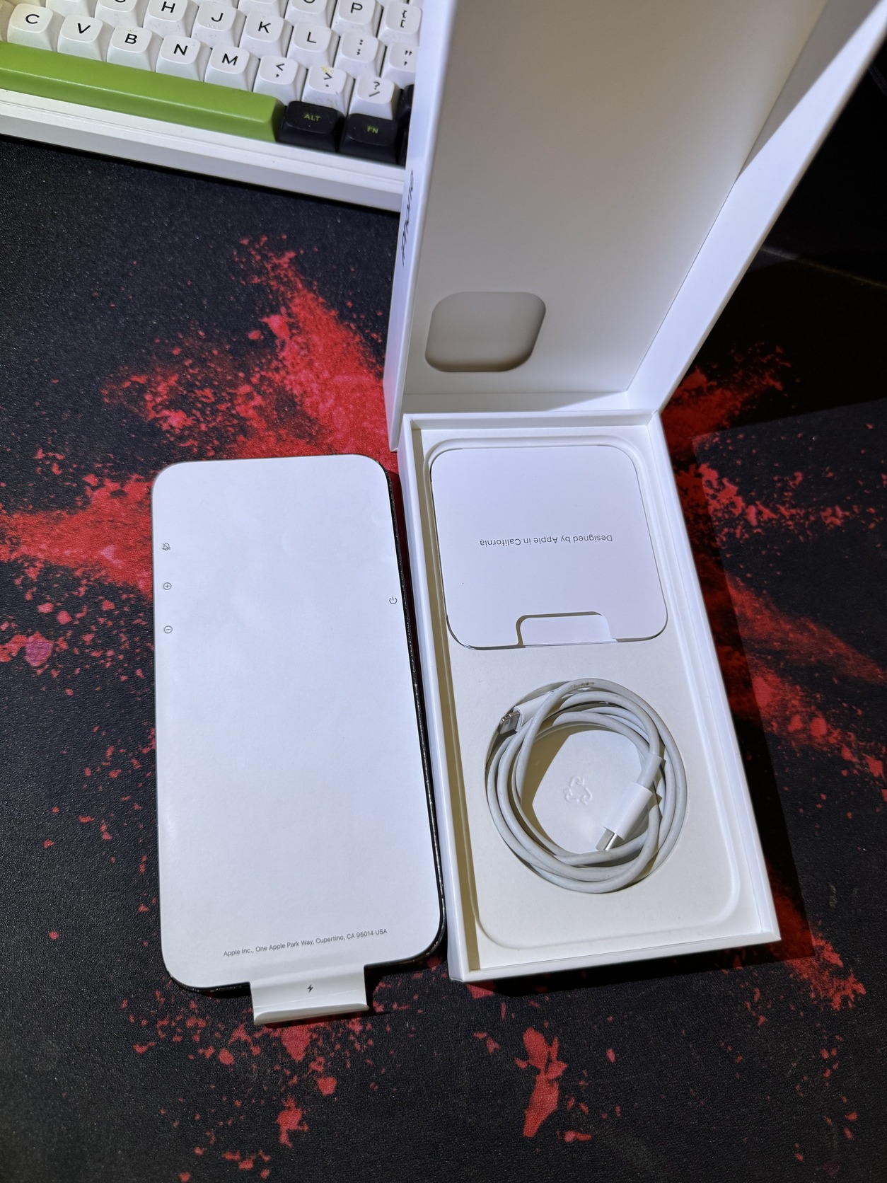 A készülékhez tartozik a doboz, a kábel és 1 vadonatúj, átlátszó MagSafe tok.