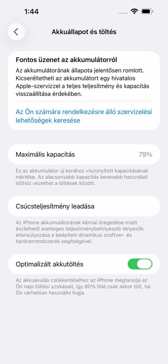 Az akkumulátor állapota 79%, ezért a rendszer javasolja a későbbi akkumulátorcserét. A készülék ettől függetlenül jól használható, az ár ezt figyelembe veszi.