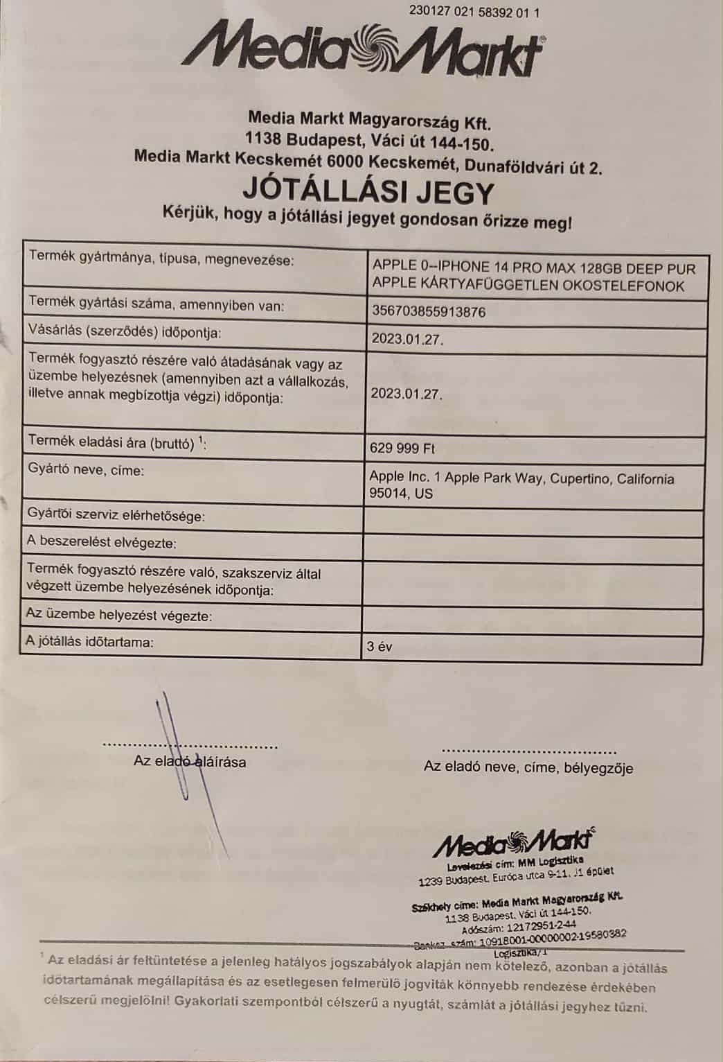 Apple jótállás vonatkozik rá 2026.01.27-ig