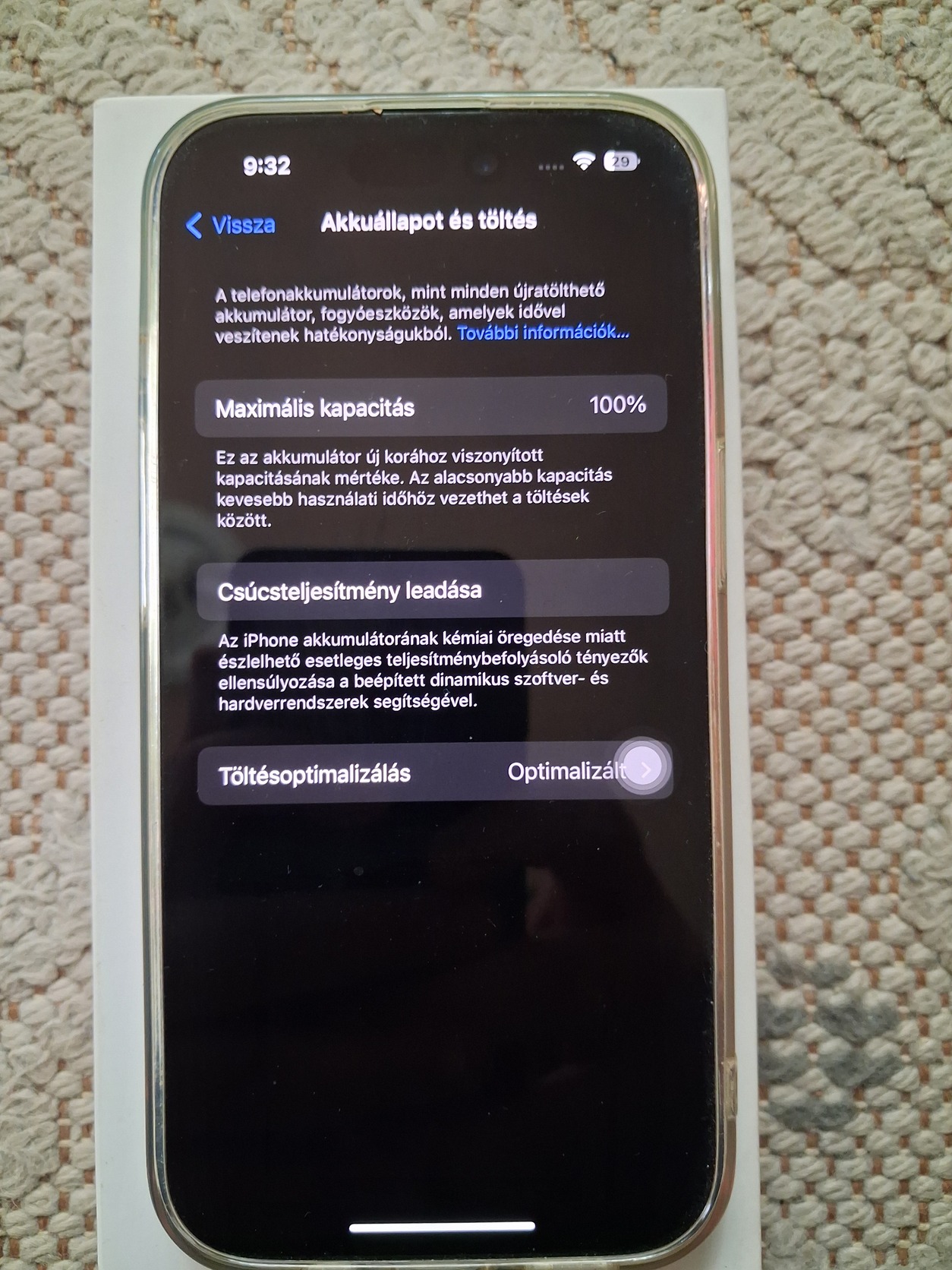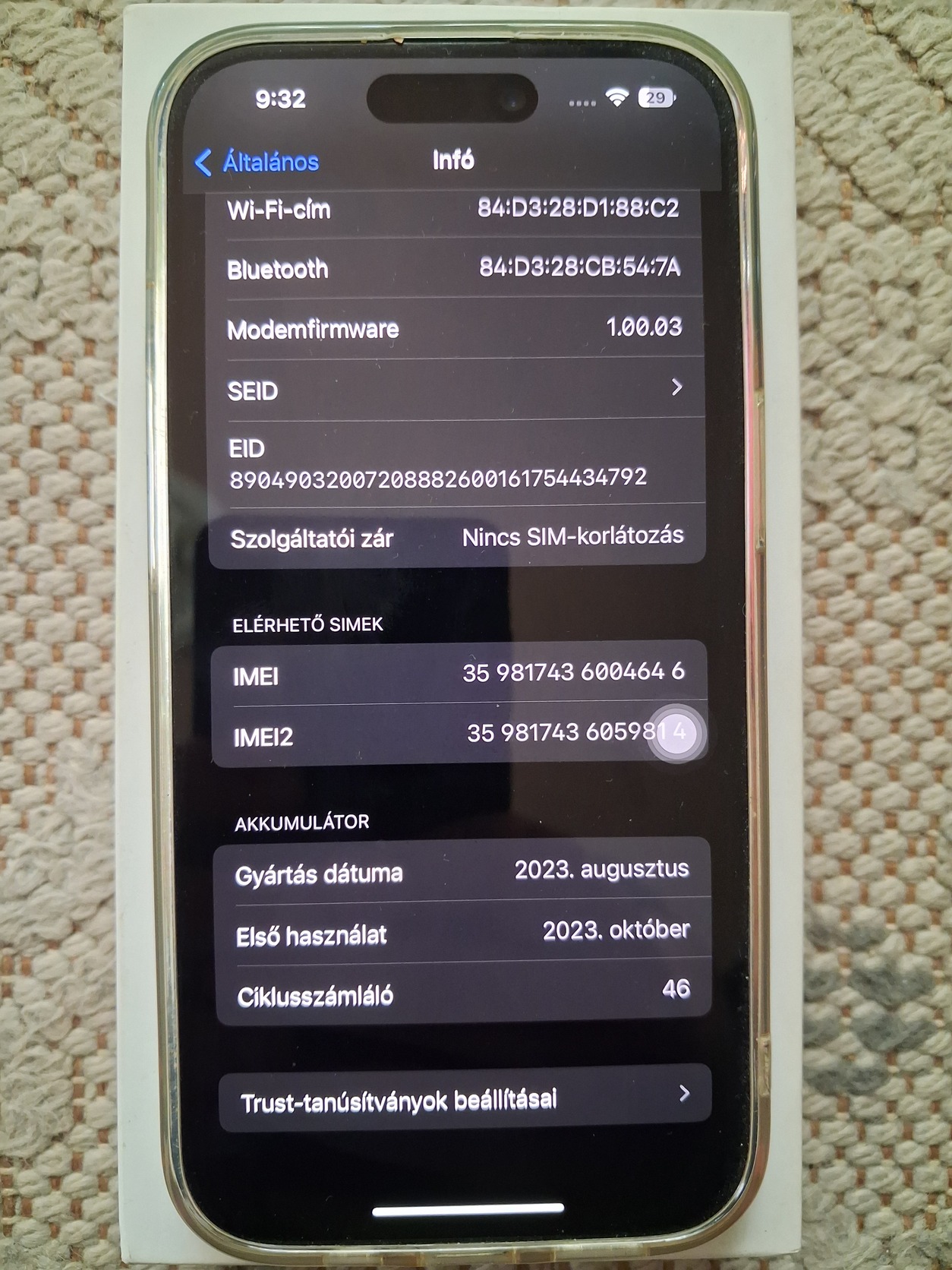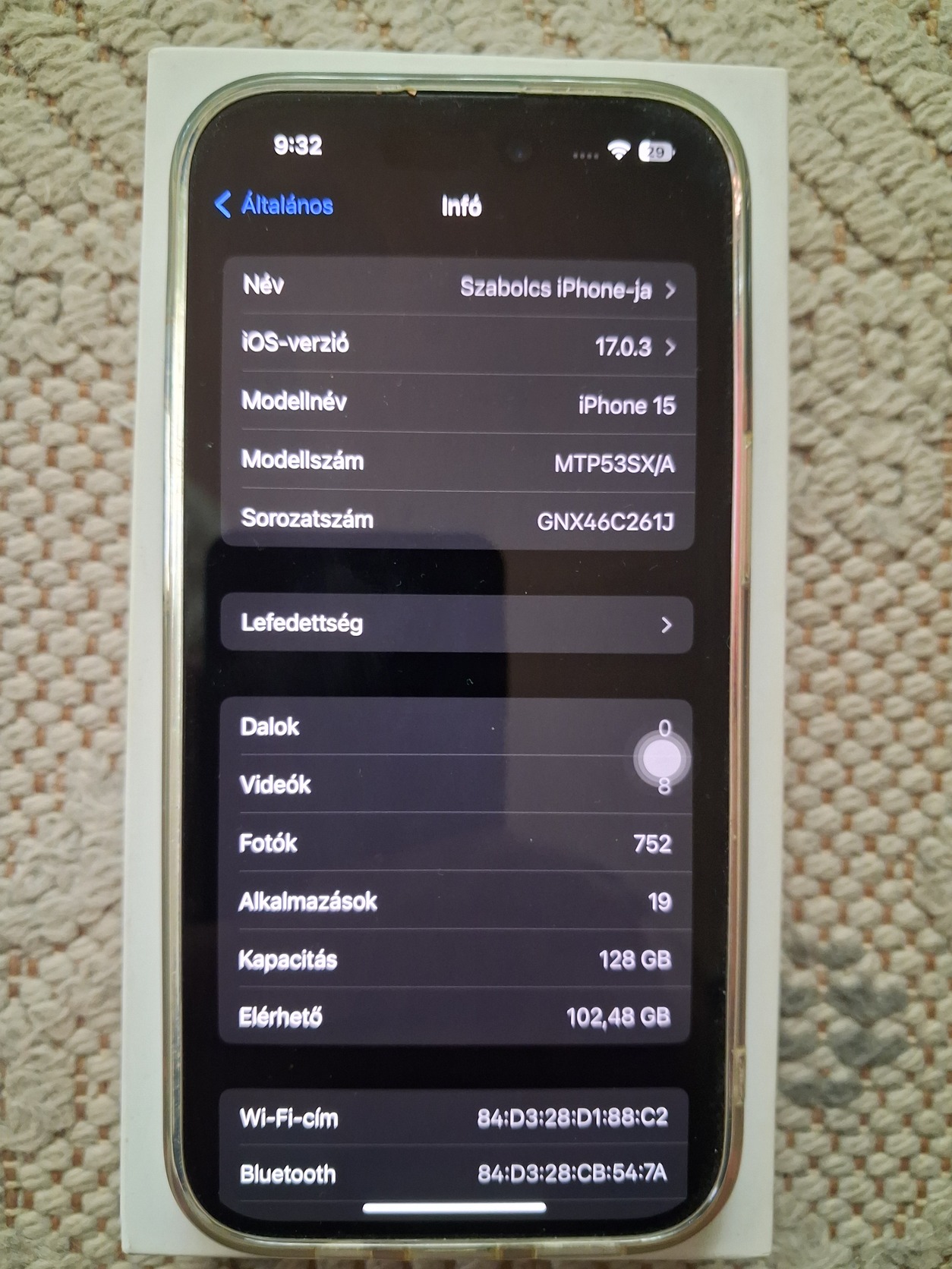 Akkuban összssen 46 ciklus, a szobát, sőt az ágyat sosem hagyta el, egyébként dobozában pihent, feltöltve, kikapcsolva, néha megjáratva! Teljesen új a telefon, és ebben nincsen semmi túlzás! Konkrétan még a szoftvere sem volt sose frissítve, az az ios 17 van rajta amivel debütált!