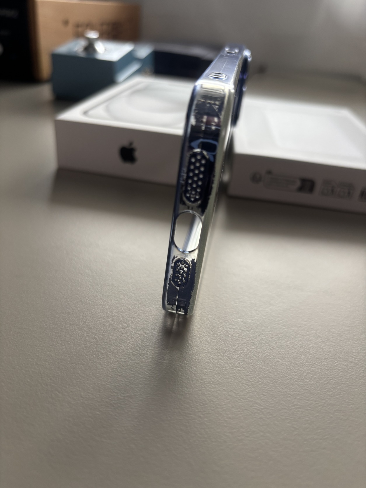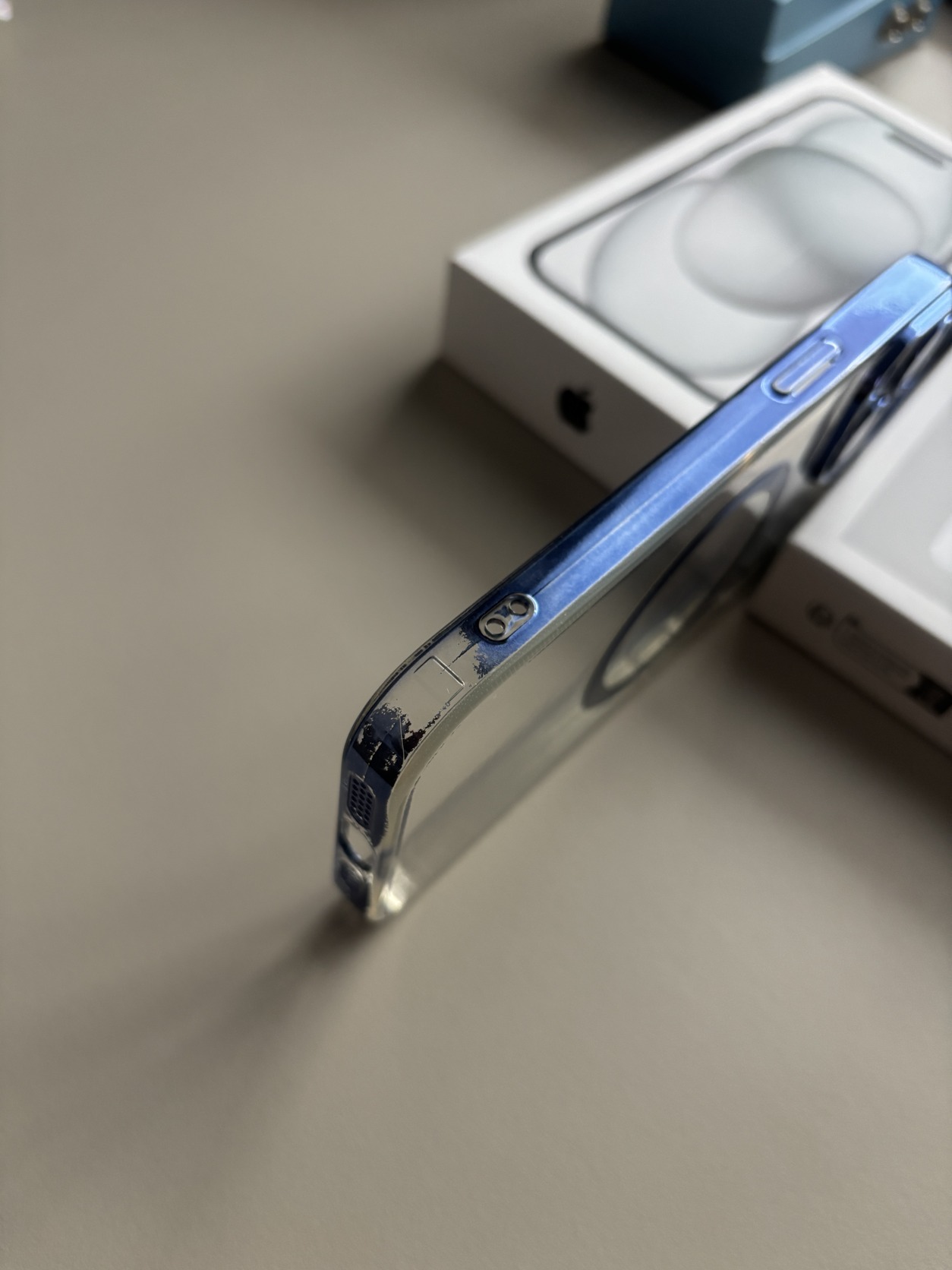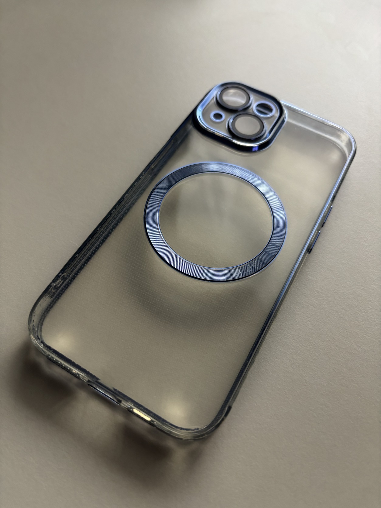 Átlátszó szilikon iPhone 15 MagSafe tok, a keretén kékes-lilás színnel. Körbe a keret mentén kopott, ezt fotóztam.