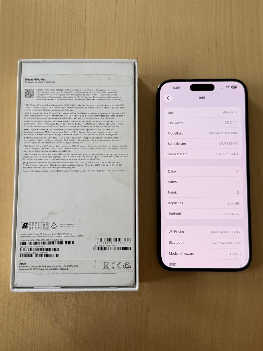 Eladó egy iPhone 15 Pro Max Kék titán színben 256 GB-os tárhellyel.