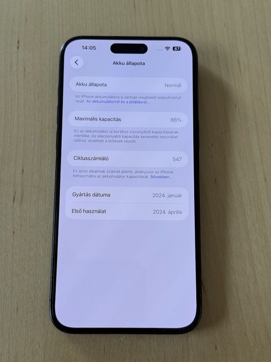 Akku állapota: 86% (gyári)
