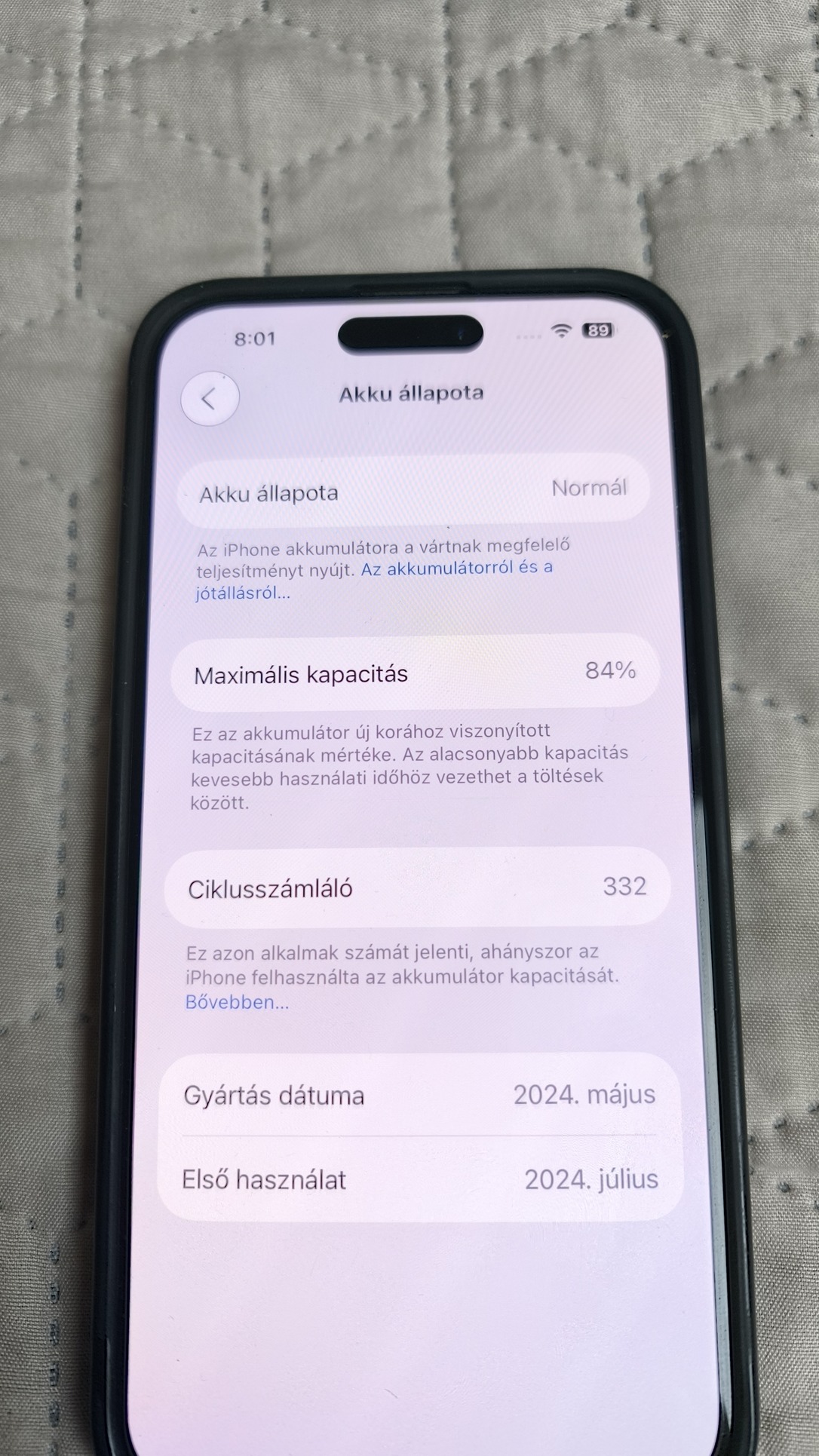 - Akkumulátor 84 %-os.