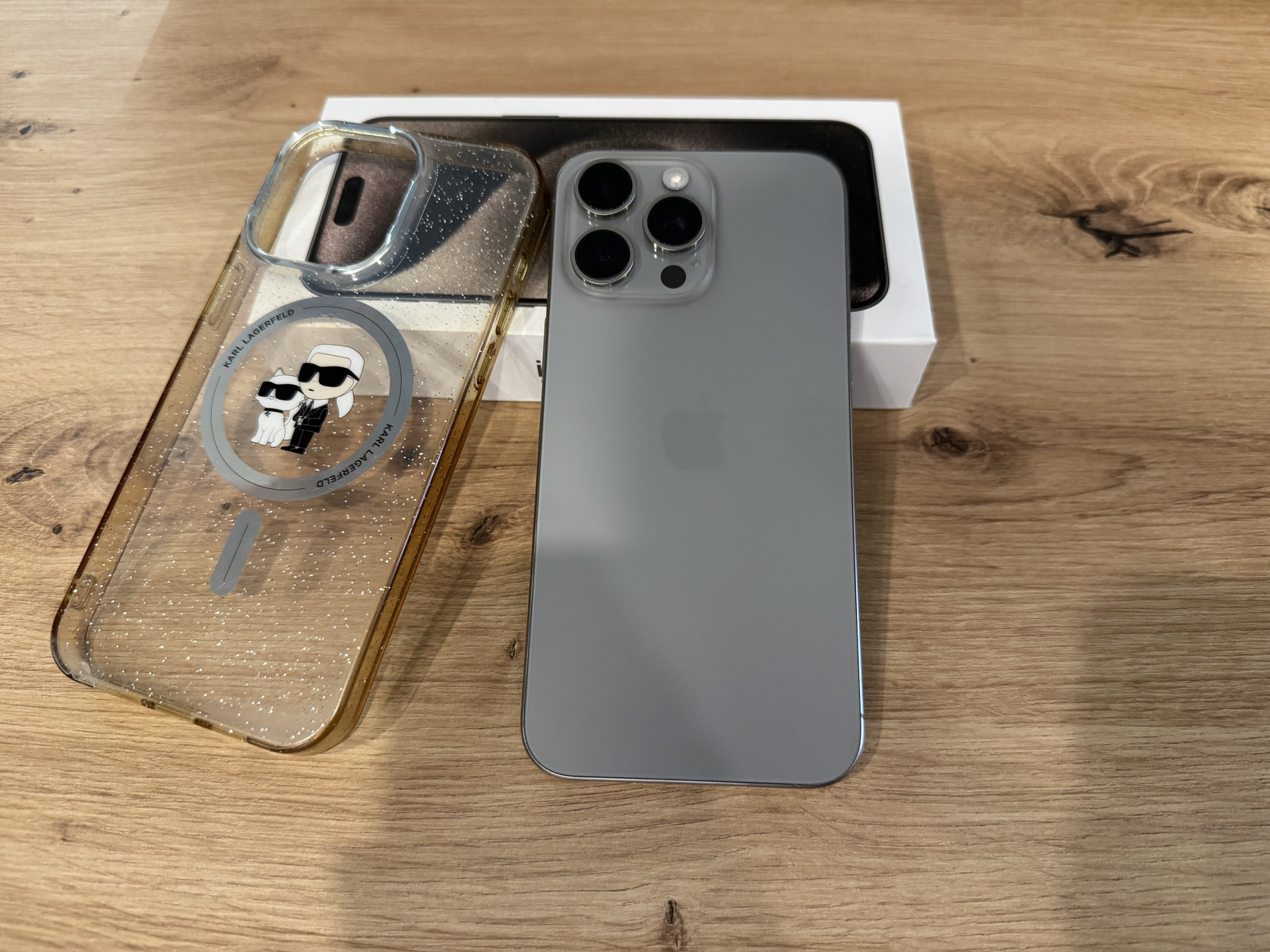 iPhone 15 Pro Max 256GB, 1 év Gari + független, Karl Lagerfeld MagSafe tokban és vadiúj üvegfóliával –