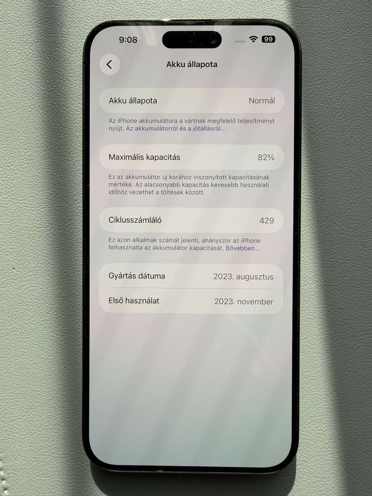 Elado iPhone 15 Pro Max kifogastalan allapotban 82%-os akksival.