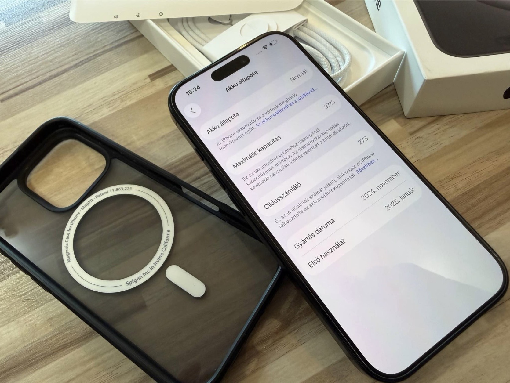 • Tartozékai: doboz, új gyári töltőkábele, Spigen Magsafe tok