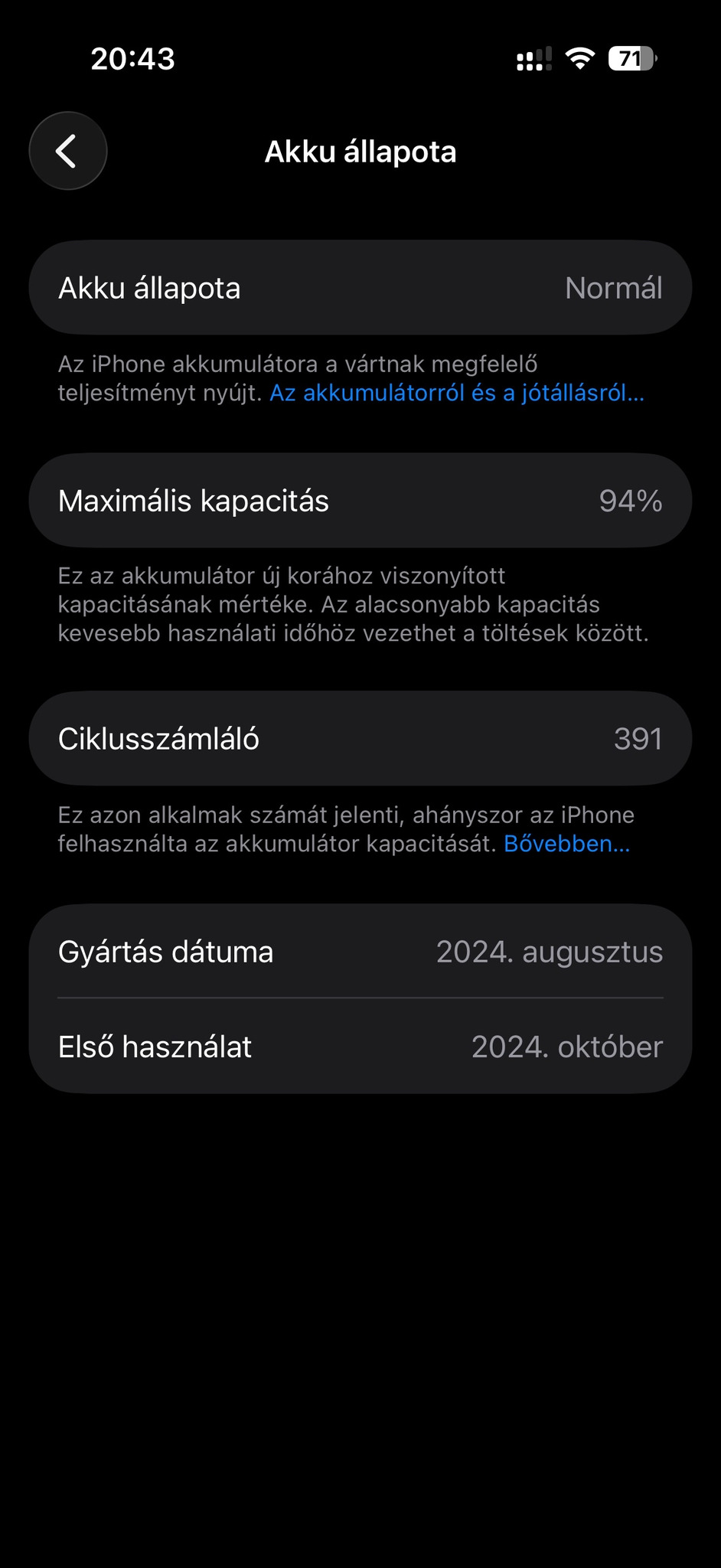 Akku állapota ahogy a kép is jelzi: 94%os, illetve a ciklusok száma is ott látszik a fotón!