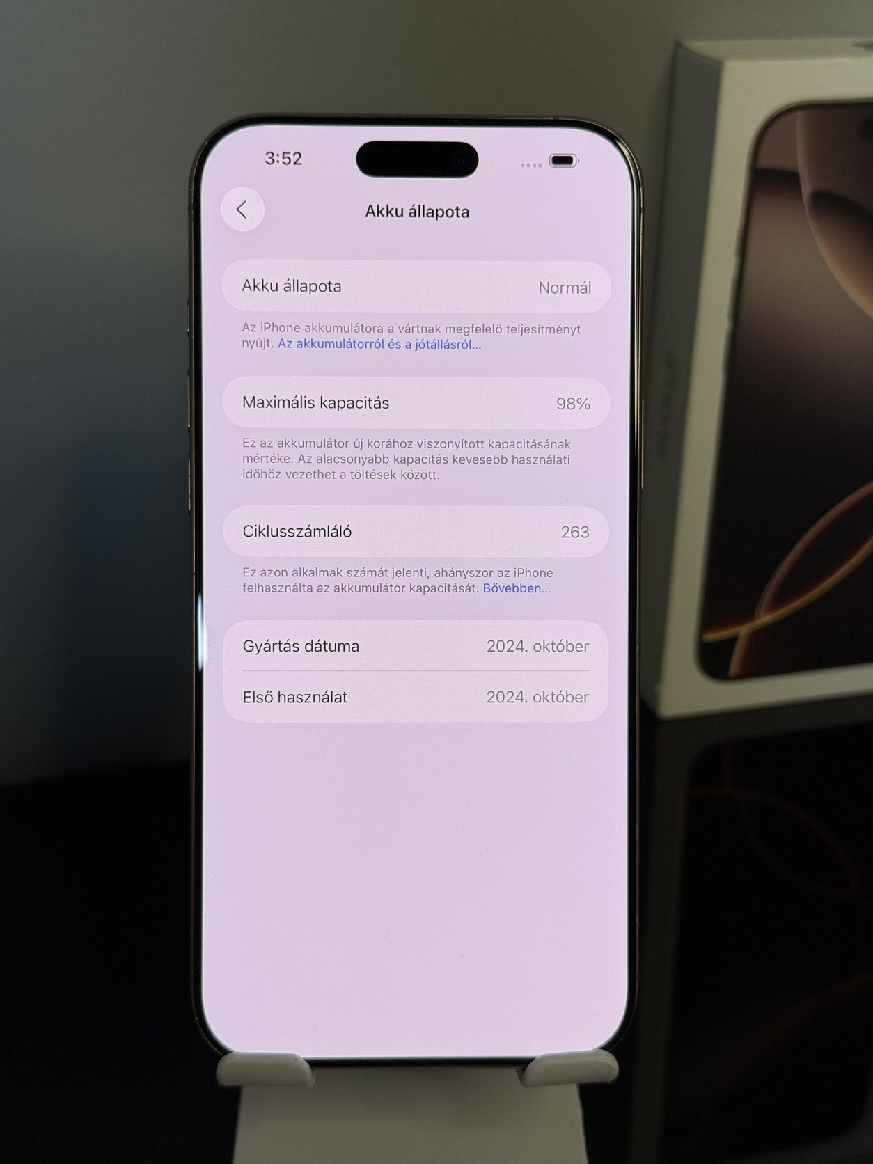 Eladó iPhone 16 Pro Max készülékem, amely független és hibátlanul működik. A kijelző gyári bontott alkatrészre lett cserélve korábbi sérülés miatt. A kereten találhatók karcok és ütődések, ezek a használatot nem befolyásolják. Az akkumulátor 98%-os, tehát szinte új állapotú.