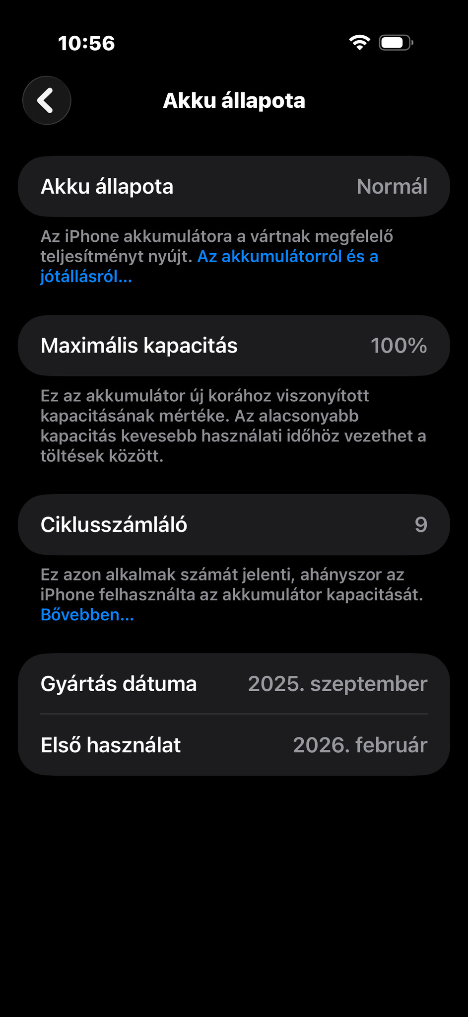 Az akkumulátor 100%-os, 9 ciklus.