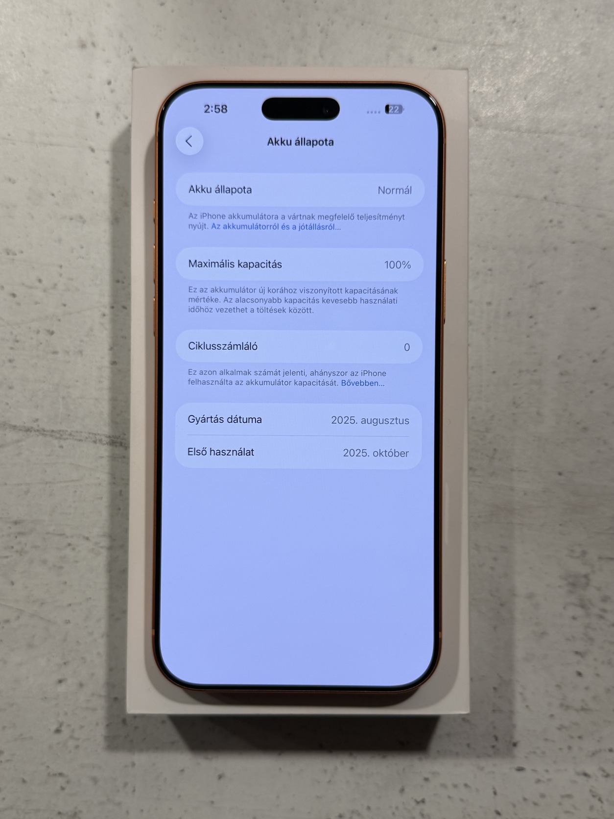 Október 9-én aktiválták, majd visszakerült a dobozába és azóta ott pihent. Ezt garantálja az akksiban lévő 0 töltési ciklus.