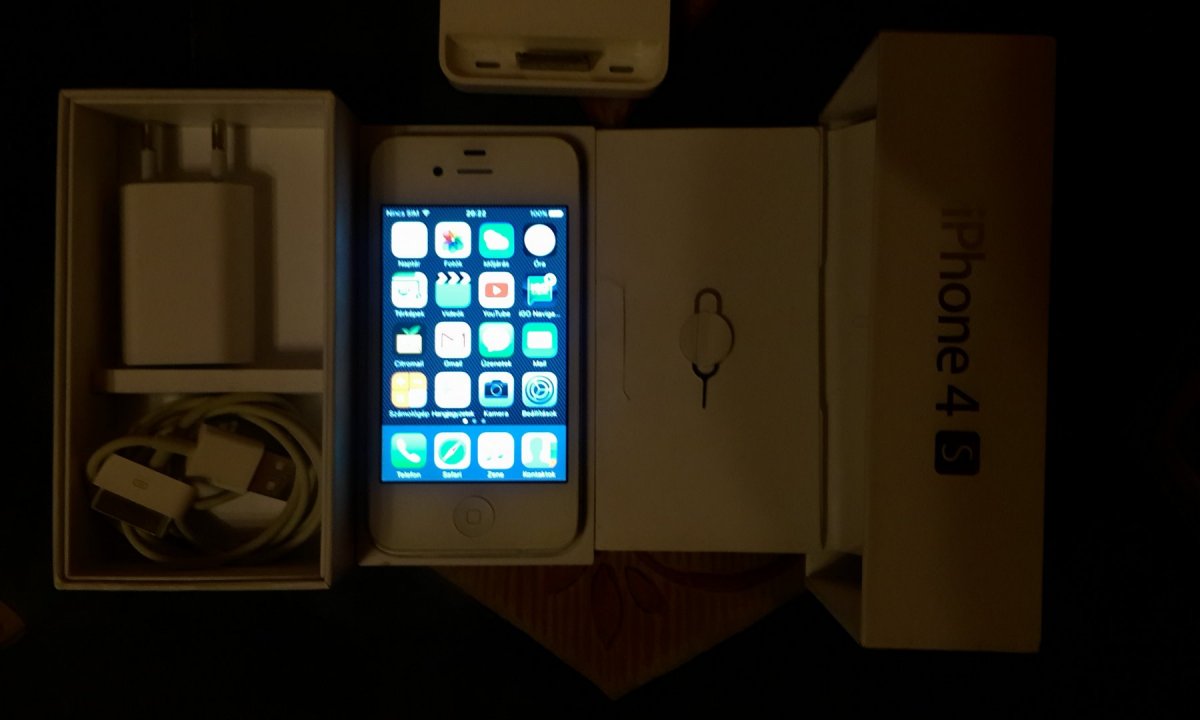 iPhone 4S 8Gb. (fehér) Gyárilag független, szép állapotban, hibátlan működéssel iOS 9.3.5, 1,5-2 napot tudó akkumulátorral. saját dobozában, gyári töltővel és adatkábellel, leírások, SIM tű + ajándék gyári dokkoló!