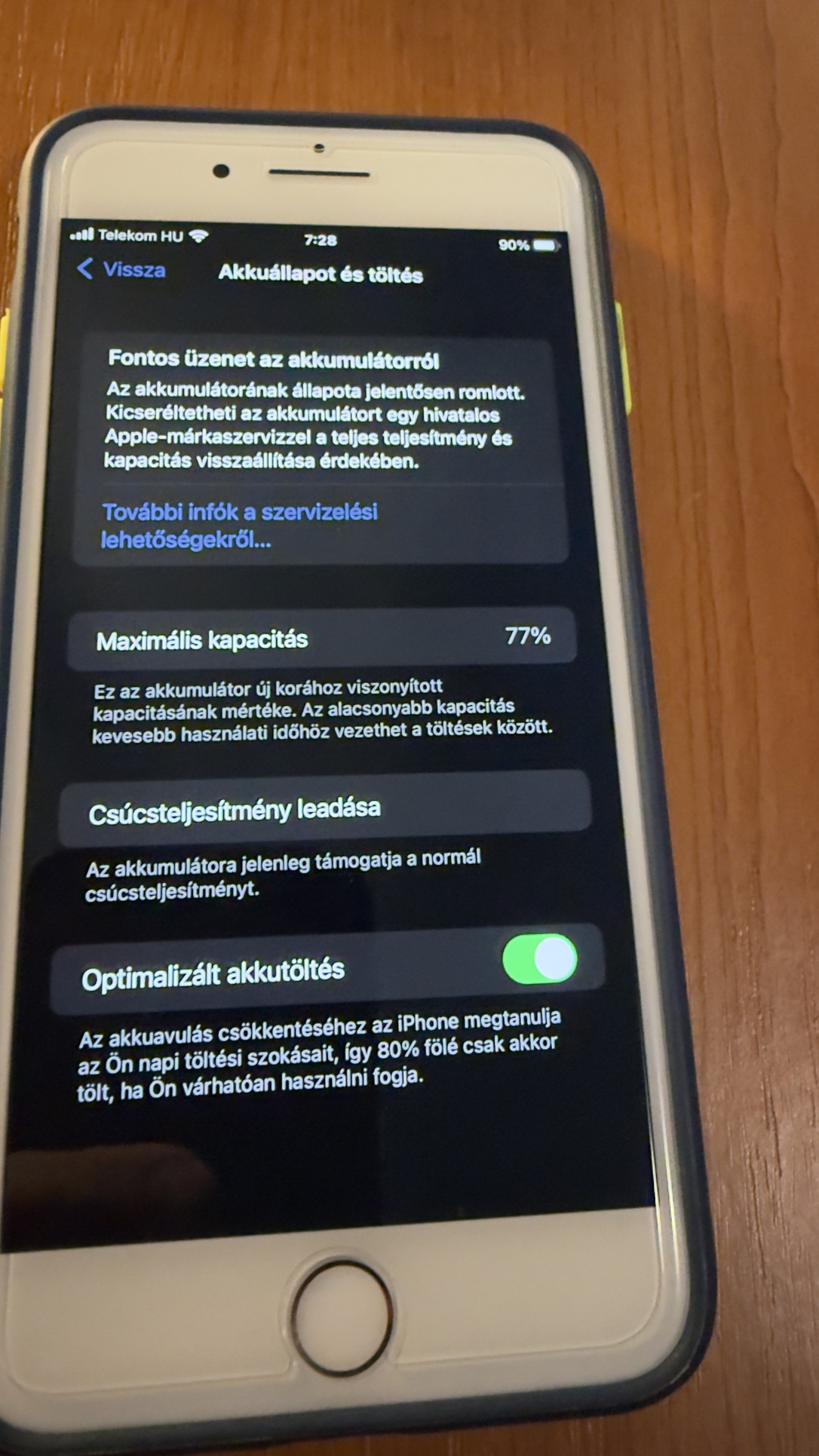 Az akkumulátor kapacitása 77%, a készülék stabil, gyors, nem melegszik. Mindig tokban és fóliával használt, így a kijelző karcmentes, a házon csak enyhe használati nyomok láthatók.