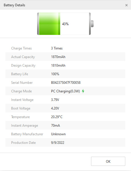 A telefon akkumulátor cserén esett át így ismeretlen alkatrészként kezeli azt, de 3uTools-rol is csatoltam egy képet amin látható hogy 3-szor volt feltöltve, átlagos használat mellett is simán bír 1 napot.